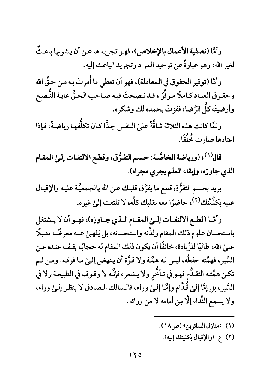 قال (¬١): (ورياضة الخاصَّة: حسم التفرُّق، وقطع الالتفات إلى المقام الذي جاوزه، وإبقاء العلم يجري مجراه).