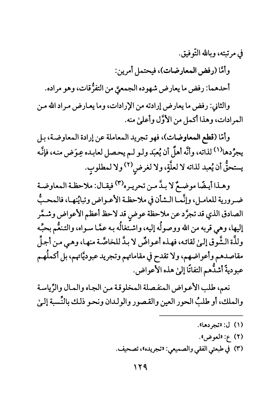 وهذا أيضًا موضعٌ لا بدَّ من تحريره (¬٣) فيقال: ملاحظة المعاوضة ضرورية للعامل، وإنَّما الشأن في ملاحظة الأعواض وتبايُنها، فالمحبُّ الصادق الذي قد تجرَّد عن ملاحظة عوضٍ قد لاحظ أعظم الأعواض وشمَّر إليها، وهي قربه من الله ووصولُه إليه، واشتغالُه به عمَّا سواه، والتنعُّم بحبِّه ولذَّة الشَّوق إلى لقائه، فهذه أعواضٌ لا بدَّ للخاصَّة منها، وهي من أجلِّ مقاصدهم وأعواضهم، ولا تقدح في مقاماتهم وتجريد عبوديَّاتهم، بل أكملُهم عبوديةً أشدُّهم التفاتًا إلى هذه الأعواض.