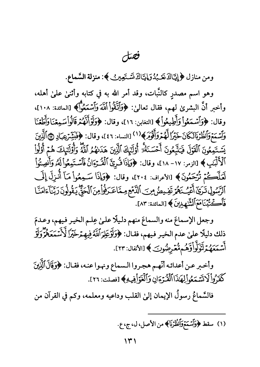 ومن منازل {إِيَّاكَ نَعْبُدُ وَإِيَّاكَ نَسْتَعِينُ}: منزلة السَّماع.