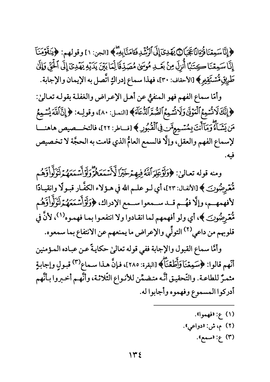 وأمّا سماع الفهم فهو المنفيُّ عن أهل الإعراض والغفلة بقوله تعالى: {إِنَّكَ لَا تُسْمِعُ الْمَوْتَى وَلَا تُسْمِعُ الصُّمَّ الدُّعَاءَ} [النمل: ٨٠]، وقولِه: {إِنَّ اللَّهَ يُسْمِعُ مَنْ يَشَاءُ وَمَا أَنْتَ بِمُسْمِعٍ مَنْ فِي الْقُبُورِ} [فاطر: ٢٢]، فالتخصيص هاهنا لإسماع الفهم والعقل، وإلَّا فالسمع العامُّ الذي قامت به الحجَّة لا تخصيص فيه.