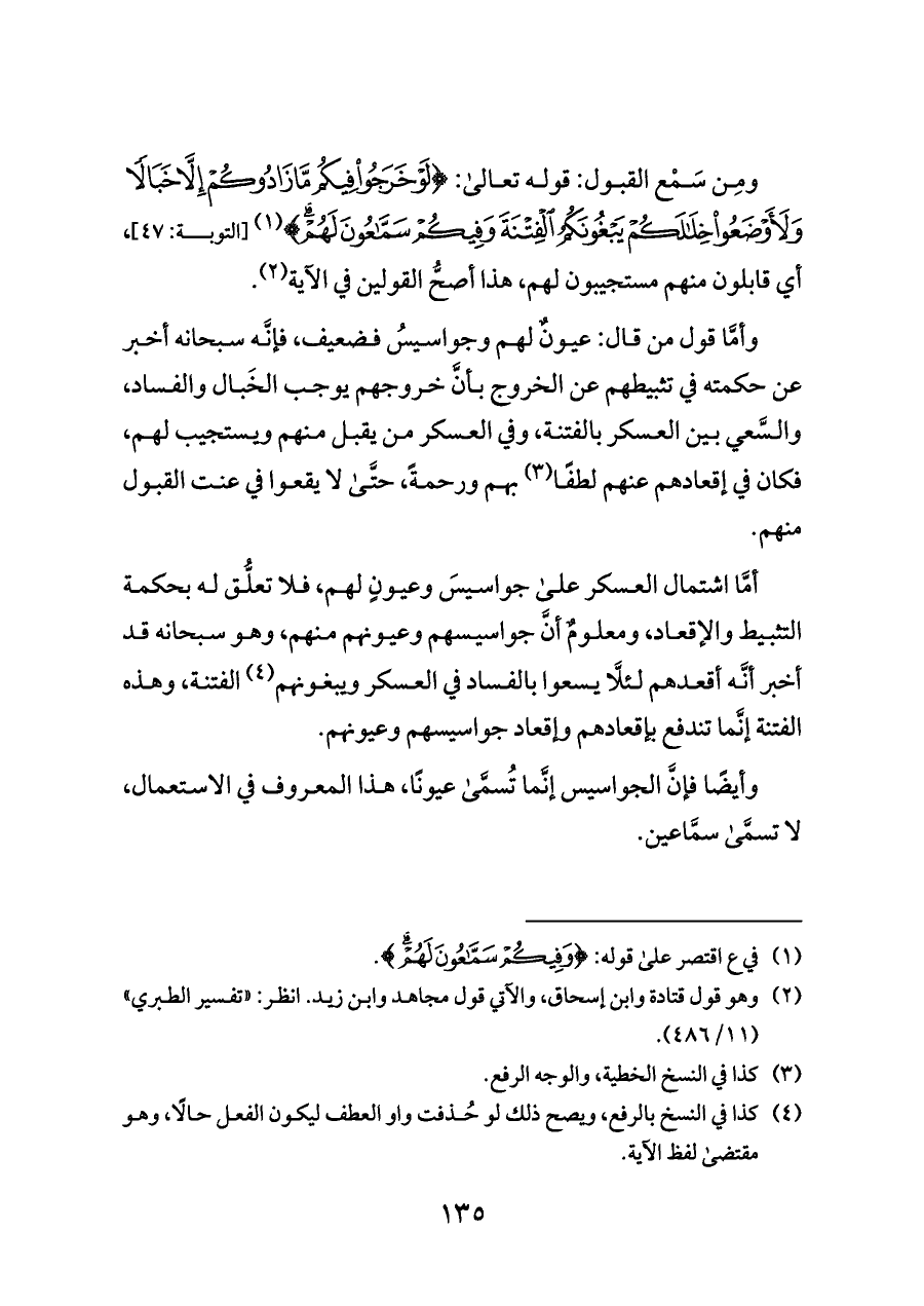 وأمَّا قول من قال: عيونٌ لهم وجواسيسُ فضعيف، فإنَّه سبحانه أخبر عن حكمته في تثبيطهم عن الخروج بأنَّ خروجهم يوجب الخَبال والفساد، والسَّعي بين العسكر بالفتنة، وفي العسكر من يقبل منهم ويستجيب لهم، فكان في إقعادهم عنهم لطفًا (¬٣) بهم ورحمةً، حتَّى لا يقعوا في عنت القبول منهم.