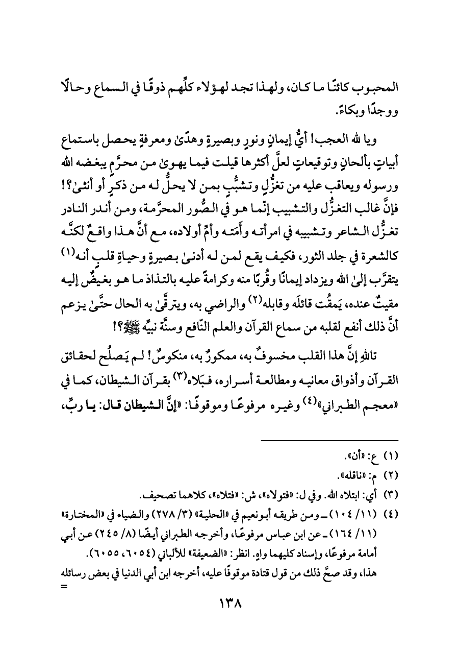 ويا لله العجب! أيُّ إيمانٍ ونورٍ وبصيرةٍ وهدًى ومعرفةٍ يحصل باستماع أبياتٍ بألحانٍ وتوقيعاتٍ لعلَّ أكثرها قيلت فيما يهوى من محرَّمٍ يبغضه الله ورسوله ويعاقب عليه من تغزُّلٍ وتشبُّبٍ بمن لا يحلُّ له من ذكرٍ أو أنثى؟! فإنَّ غالب التغزُّل والتشبيب إنّما هو في الصُّور المحرَّمة، ومن أندر النادر تغزُّل الشاعر وتشبيبه في امرأته وأَمَته وأمِّ أولاده، مع أنَّ هذا واقعٌ لكنَّه كالشعرة في جلد الثور، فكيف يقع لمن له أدنى بصيرةٍ وحياةِ قلبٍ أنه (¬١) يتقرَّب إلى الله ويزداد إيمانًا وقُربًا منه وكرامةً عليه بالتذاذ ما هو بغيضٌ إليه مقيتٌ عنده، يَمقُت قائلَه وقابله (¬٢) والراضي به، ويترقَّى به الحال حتَّى يزعم أنَّ ذلك أنفع لقلبه من سماع القرآن والعلم النّافع وسنَّة نبيِّه - صلى الله عليه وسلم -؟!