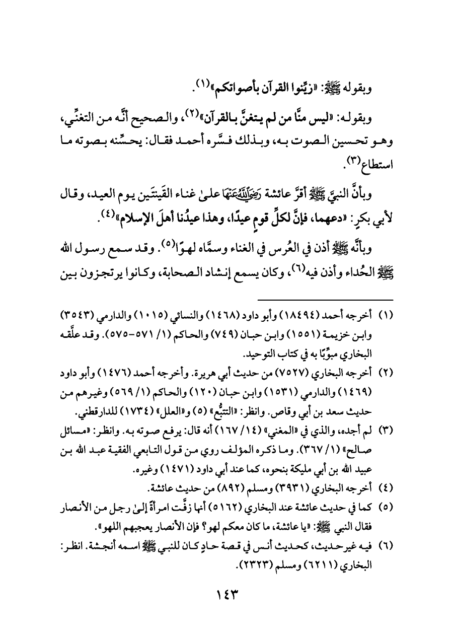 وبأنَّ النبيَّ - صلى الله عليه وسلم - أقرَّ عائشة - رضي الله عنها - على غناء القَينتَين يوم العيد، وقال لأبي بكرٍ: «دعهما، فإنَّ لكلِّ قومٍ عيدًا، وهذا عيدُنا أهلَ الإسلام» (¬٤).