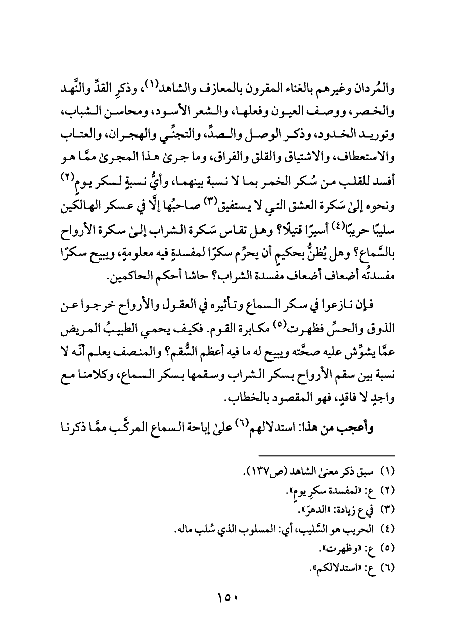 فإن نازعوا في سكر السماع وتأثيره في العقول والأرواح خرجوا عن الذوق والحسِّ فظهرت (¬٥) مكابرة القوم. فكيف يحمي الطبيبُ المريض عمَّا يشوِّش عليه صحَّته ويبيح له ما فيه أعظم السُّقم؟ والمنصف يعلم أنّه لا نسبة بين سقم الأرواح بسكر الشراب وسقمها بسكر السماع، وكلامنا مع واجدٍ لا فاقدٍ، فهو المقصود بالخطاب.