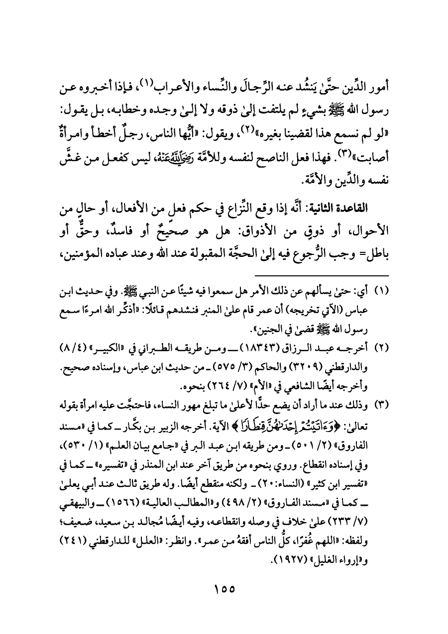 القاعدة الثانية: أنَّه إذا وقع النِّزاع في حكم فعلٍ من الأفعال، أو حالٍ من الأحوال، أو ذوقٍ من الأذواق: هل هو صحيحٌ أو فاسدٌ، وحقٌّ أو باطل= وجب الرُّجوع فيه إلى الحجَّة المقبولة عند الله وعند عباده المؤمنين،