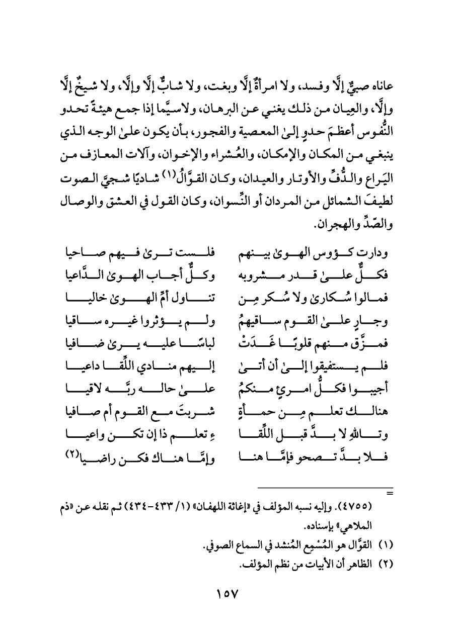 عاناه صبيٌّ إلَّا وفسد، ولا امرأةٌ إلَّا وبغت، ولا شابٌّ إلَّا وإلَّا، ولا شيخٌ إلَّا وإلَّا، والعِيان من ذلك يغني عن البرهان، ولاسيَّما إذا جمع هيئةً تحدو النُّفوس أعظمَ حدوٍ إلى المعصية والفجور، بأن يكون على الوجه الذي ينبغي من المكان والإمكان، والعُشراء والإخوان، وآلات المعازف من اليَراع والدُّفِّ والأوتار والعيدان، وكان القوَّالُ (¬١) شاديًا شجيَّ الصوت لطيفَ الشمائل من المردان أو النِّسوان، وكان القول في العشق والوصال والصّدِّ والهجران.