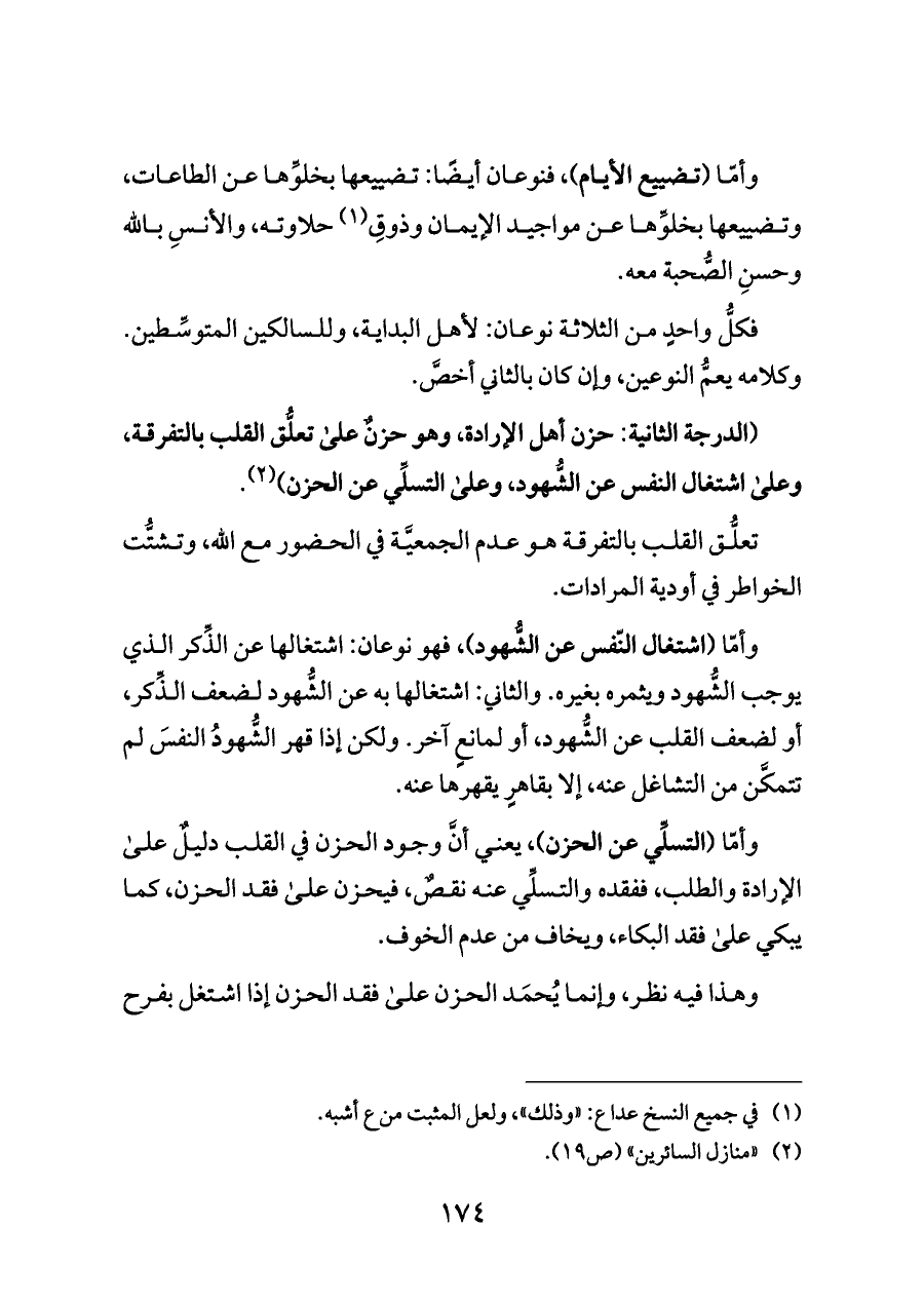 (الدرجة الثانية: حزن أهل الإرادة، وهو حزنٌ على تعلُّق القلب بالتفرقة، وعلى اشتغال النفس عن الشُّهود، وعلى التسلِّي عن الحزن) (¬٢).