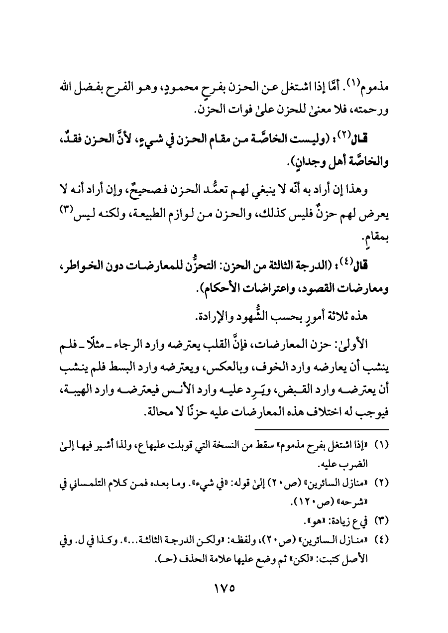 قال (¬٤): (الدرجة الثالثة من الحزن: التحزُّن للمعارضات دون الخواطر، ومعارضات القصود، واعتراضات الأحكام).