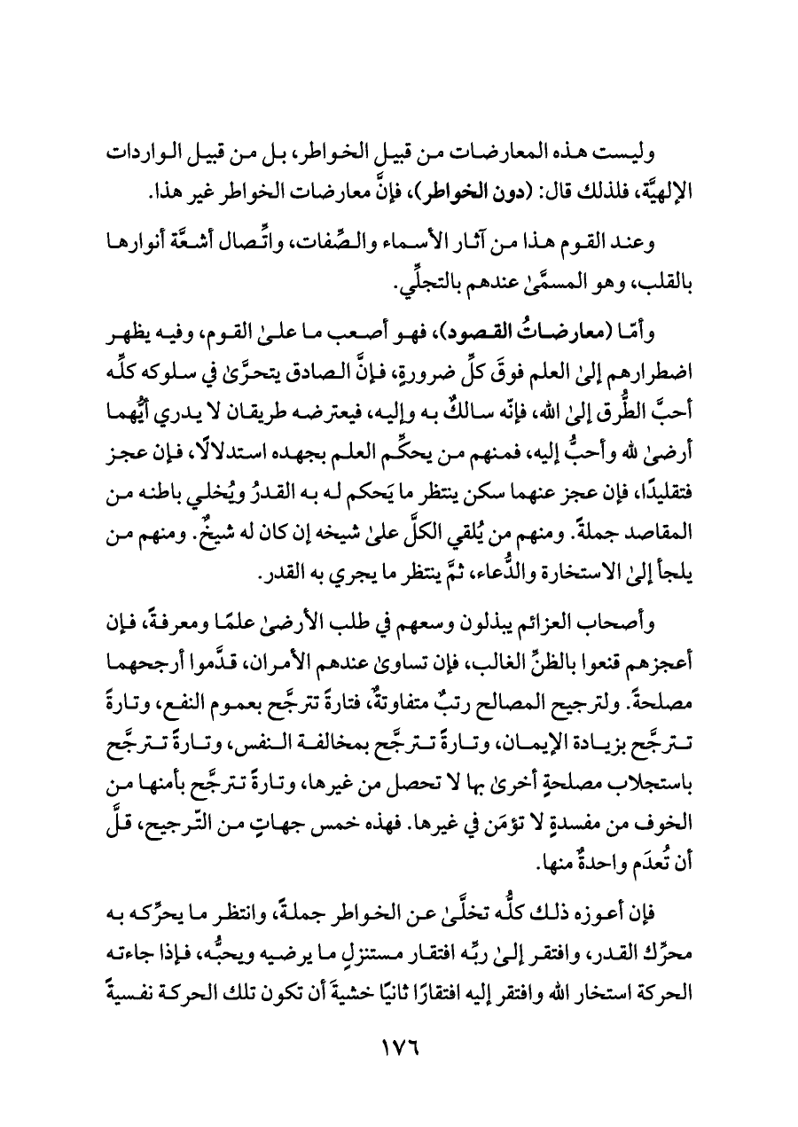 وأمّا (معارضاتُ القصود)، فهو أصعب ما على القوم، وفيه يظهر اضطرارهم إلى العلم فوقَ كلِّ ضرورةٍ، فإنَّ الصادق يتحرَّى في سلوكه كلِّه أحبَّ الطُّرق إلى الله، فإنّه سالكٌ به وإليه، فيعترضه طريقان لا يدري أيُّهما أرضى لله وأحبُّ إليه، فمنهم من يحكِّم العلم بجهده استدلالًا، فإن عجز فتقليدًا، فإن عجز عنهما سكن ينتظر ما يَحكم له به القدرُ ويُخلي باطنه من المقاصد جملةً. ومنهم من يُلقي الكلَّ على شيخه إن كان له شيخٌ. ومنهم من يلجأ إلى الاستخارة والدُّعاء، ثمَّ ينتظر ما يجري به القدر.