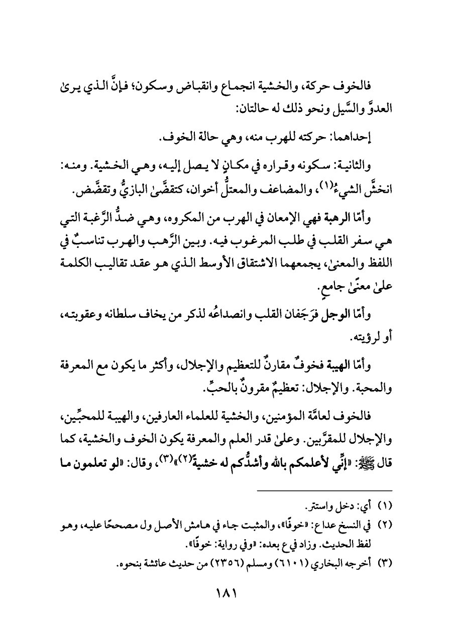 فالخوف لعامَّة المؤمنين، والخشية للعلماء العارفين، والهيبة للمحبِّين، والإجلال للمقرَّبين. وعلى قدر العلم والمعرفة يكون الخوف والخشية، كما قال - صلى الله عليه وسلم -: «إنِّي لأعلمكم بالله وأشدُّكم له خشيةً (¬٢)» (¬٣)، وقال: «لو تعلمون ما