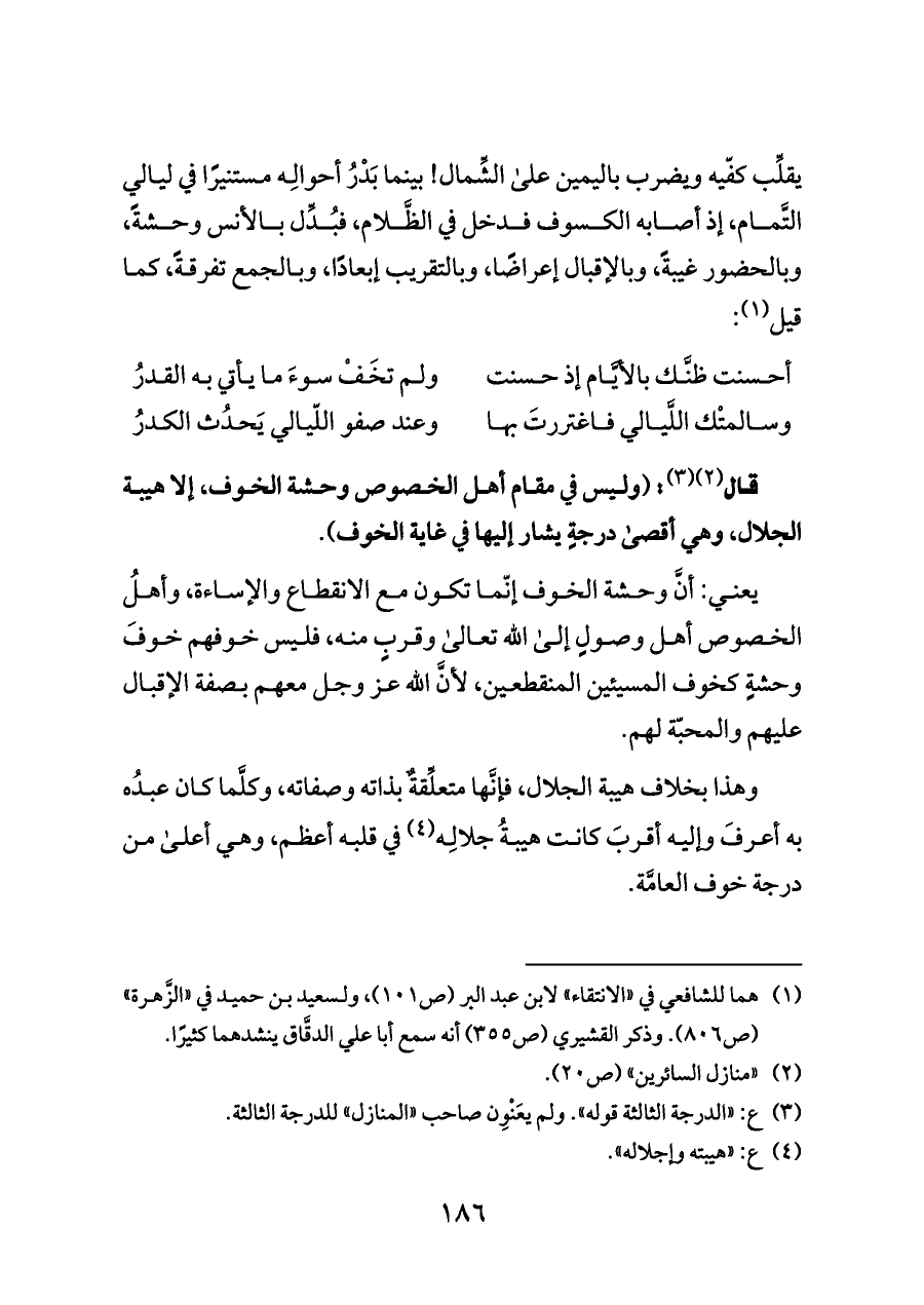 قال (¬٢) (¬٣): (وليس في مقام أهل الخصوص وحشة الخوف، إلا هيبة الجلال، وهي أقصى درجةٍ يشار إليها في غاية الخوف).