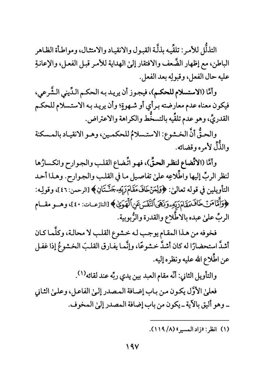 وأمَّا (الاستسلام للحكم)، فيجوز أن يريد به الحكم الدِّيني الشَّرعي، فيكون معناه عدم معارضته برأي أو شهوةٍ؛ وأن يريد به الاستسلام للحكم القدريِّ، وهو عدم تلقِّيه بالتسخُّط والكراهة والاعتراض.
