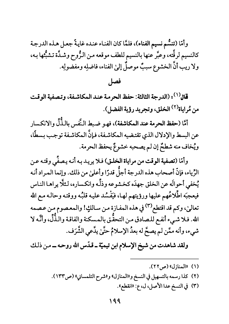 وأمّا (تنسُّم نسيم الفناء)، فلمَّا كان الفناء عنده غايةً جعل هذه الدرجة كالنسيم لرقَّته، وعبَّر عنها بالنسيم للطف موقعه من الرُّوح وشدَّة تشبُّثها به، ولا ريب أنَّ الخشوع سببٌ موصلٌ إلى الفناء، فاضلِه ومفضولِه.