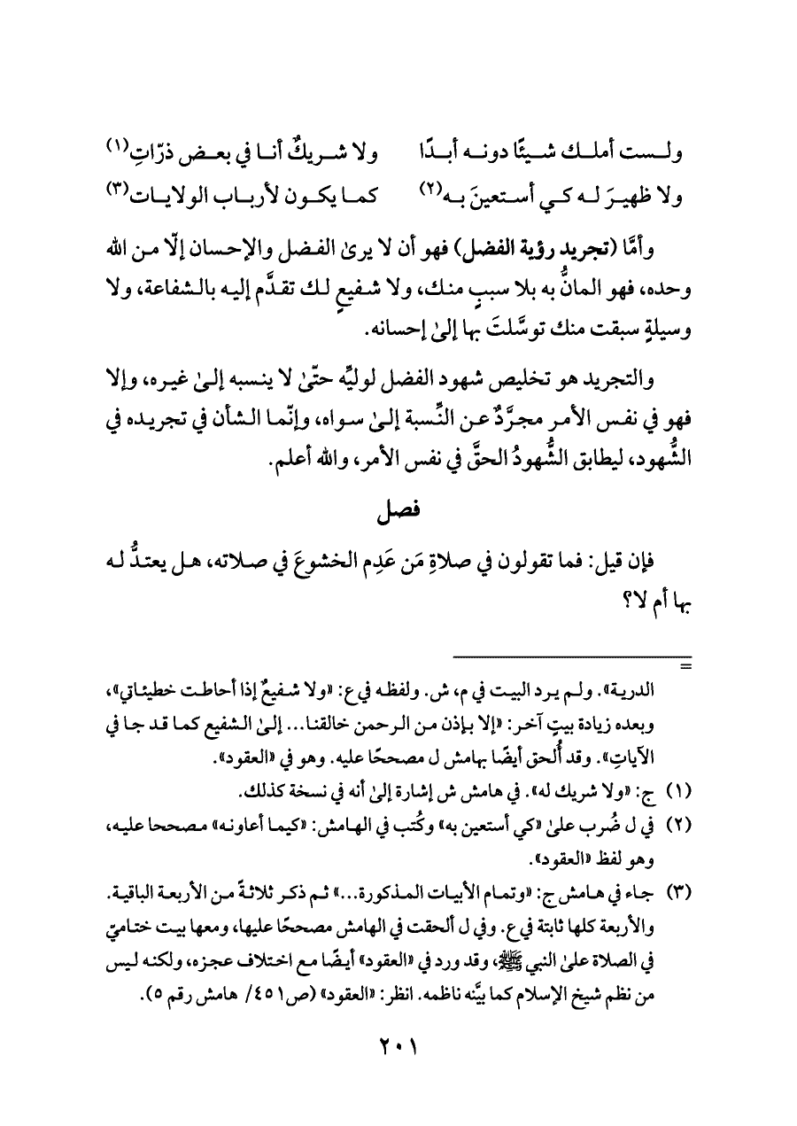 (¬٣) جاء في هامش ج: «وتمام الأبيات المذكورة ... » ثم ذكر ثلاثةً من الأربعة الباقية. والأربعة كلها ثابتة في ع. وفي ل ألحقت في الهامش مصححًا عليها، ومعها بيت ختاميّ في الصلاة على النبي - صلى الله عليه وسلم -، وقد ورد في «العقود» أيضًا مع اختلاف عجزه، ولكنه ليس من نظم شيخ الإسلام كما بيَّنه ناظمه. انظر: «العقود» (ص ٤٥١/ هامش رقم ٥).