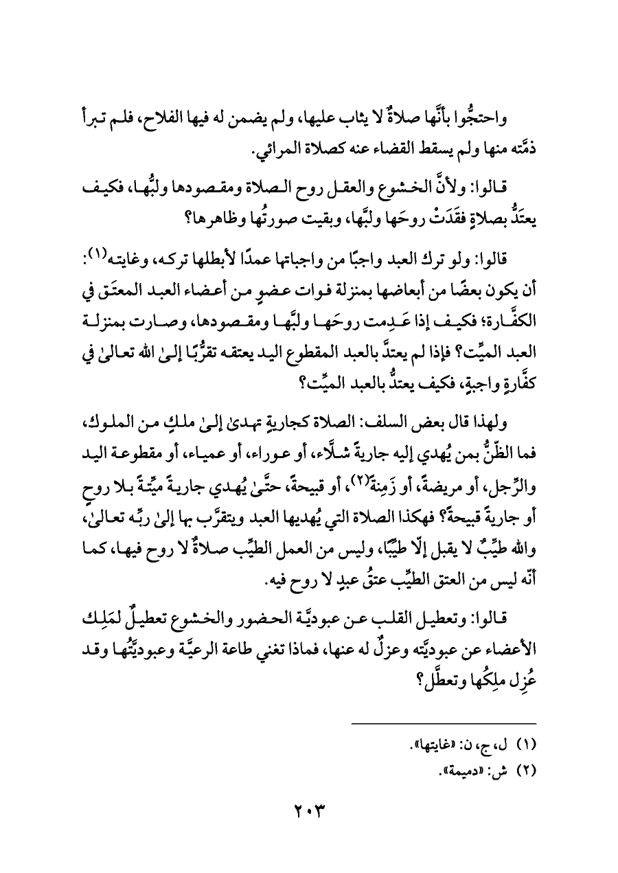 ولهذا قال بعض السلف: الصلاة كجاريةٍ تهدى إلى ملكٍ من الملوك، فما الظّنُّ بمن يُهدي إليه جاريةً شلَّاء، أو عوراء، أو عمياء، أو مقطوعة اليد والرِّجل، أو مريضةً، أو زَمِنةً (¬٢)، أو قبيحةً، حتَّى يُهدي جاريةً ميِّتةً بلا روحٍ أو جاريةً قبيحةً؟ فهكذا الصلاة التي يُهديها العبد ويتقرَّب بها إلى ربِّه تعالى، والله طيِّبٌ لا يقبل إلّا طيِّبًا، وليس من العمل الطيِّب صلاةٌ لا روح فيها، كما أنّه ليس من العتق الطيِّب عتقُ عبدٍ لا روح فيه.