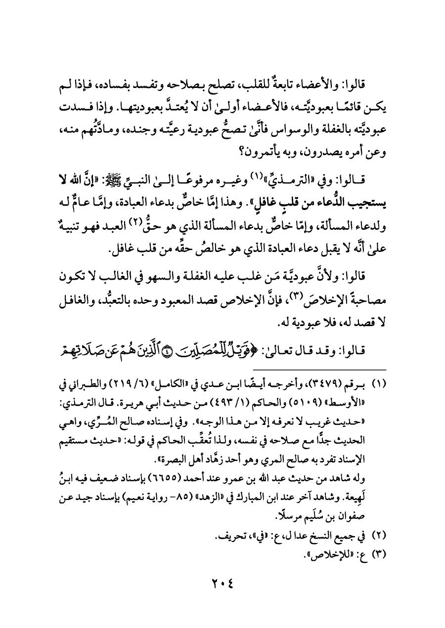 وغيره مرفوعًا إلى النبيِّ - صلى الله عليه وسلم -: «إنَّ الله لا يستجيب الدُّعاء من قلبٍ غافلٍ». وهذا إمَّا خاصٌّ بدعاء العبادة، وإمَّا عامٌّ له ولدعاء المسألة، وإمّا خاصٌّ بدعاء المسألة الذي هو حقُّ (¬٢) العبد فهو تنبيهٌ على أنَّه لا يقبل دعاء العبادة الذي هو خالصُ حقِّه من قلب غافل.