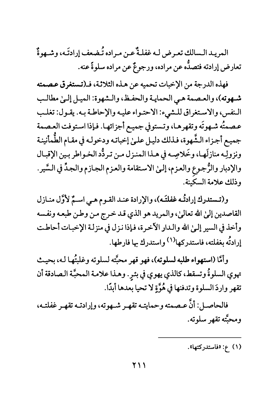 المريد السالك تعرض له غفلةٌ عن مراده تُضعف إرادتَه، وشهوةٌ تعارض إرادته فتصدُّه عن مراده، ورجوعٌ عن مراده سلوةً عنه.