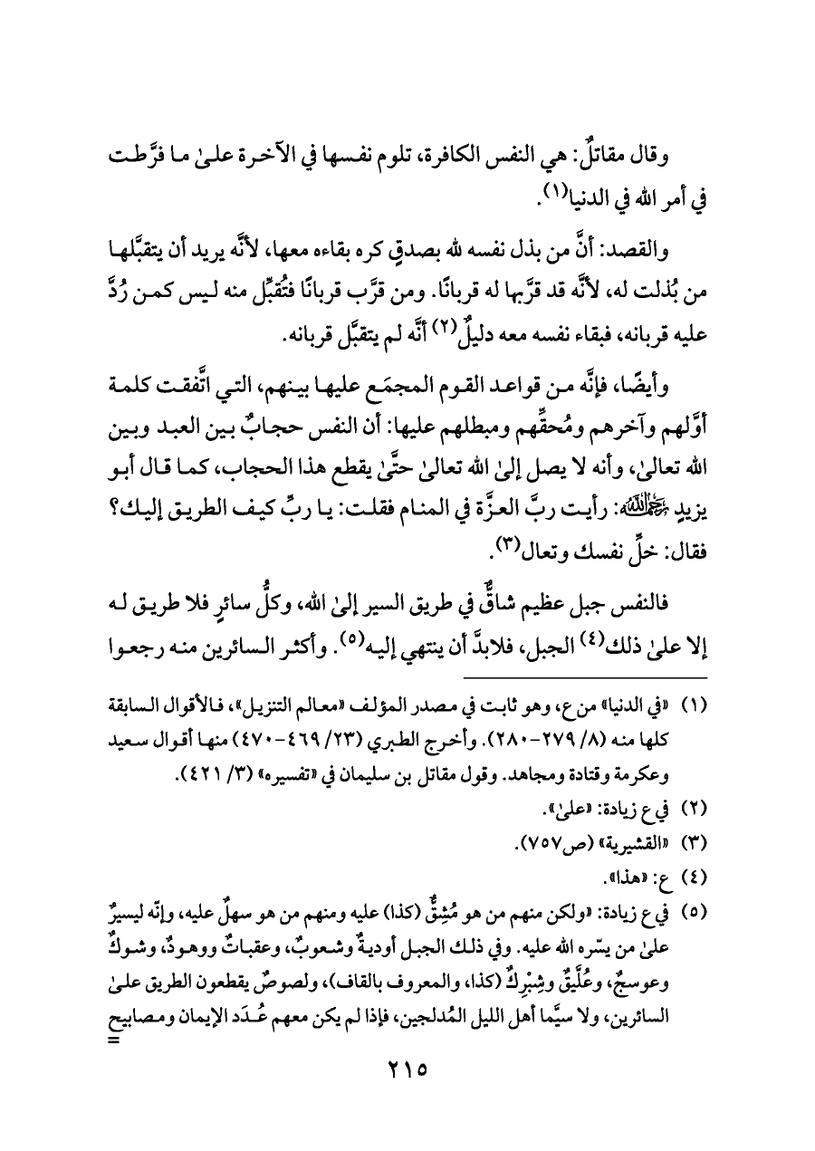 (¬٥) في ع زيادة: «ولكن منهم من هو مُشِقٌّ (كذا) عليه ومنهم من هو سهلٌ عليه، وإنّه ليسيرٌ على من يسّره الله عليه. وفي ذلك الجبل أوديةٌ وشعوبٌ، وعقباتٌ ووهودٌ، وشوكٌ وعوسجٌ، وعُلَّيقٌ وشِبْرِكٌ (كذا، والمعروف بالقاف)، ولصوصٌ يقطعون الطريق على السائرين، ولا سيَّما أهل الليل المُدلجين، فإذا لم يكن معهم عُدَد الإيمان ومصابيح اليقين تَقِد بزيت الإخبات، وإلَّا تعلَّقت بهم تلك الموانع وتشبَّثت بهم تلك القواطع وحالت بينهم وبين السَّير، فإن أكثر ... ».