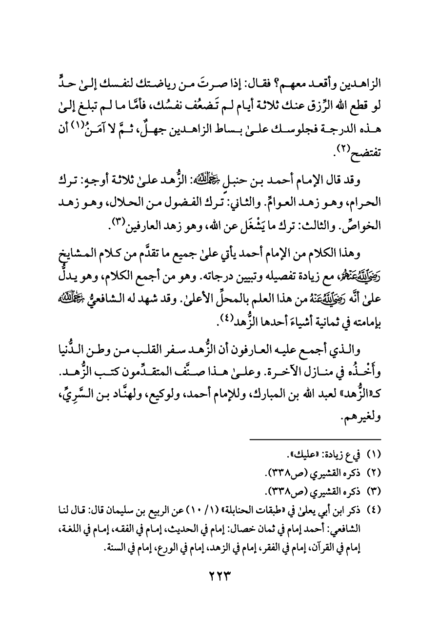 وهذا الكلام من الإمام أحمد يأتي على جميع ما تقدَّم من كلام المشايخ - رضي الله عنهم -، مع زيادة تفصيله وتبيين درجاته. وهو من أجمع الكلام، وهو يدلُّ على أنَّه - رضي الله عنه - من هذا العلم بالمحلِّ الأعلى. وقد شهد له الشافعيُّ - رحمه الله - بإمامته في ثمانية أشياءَ أحدها الزُّهد (¬٤).