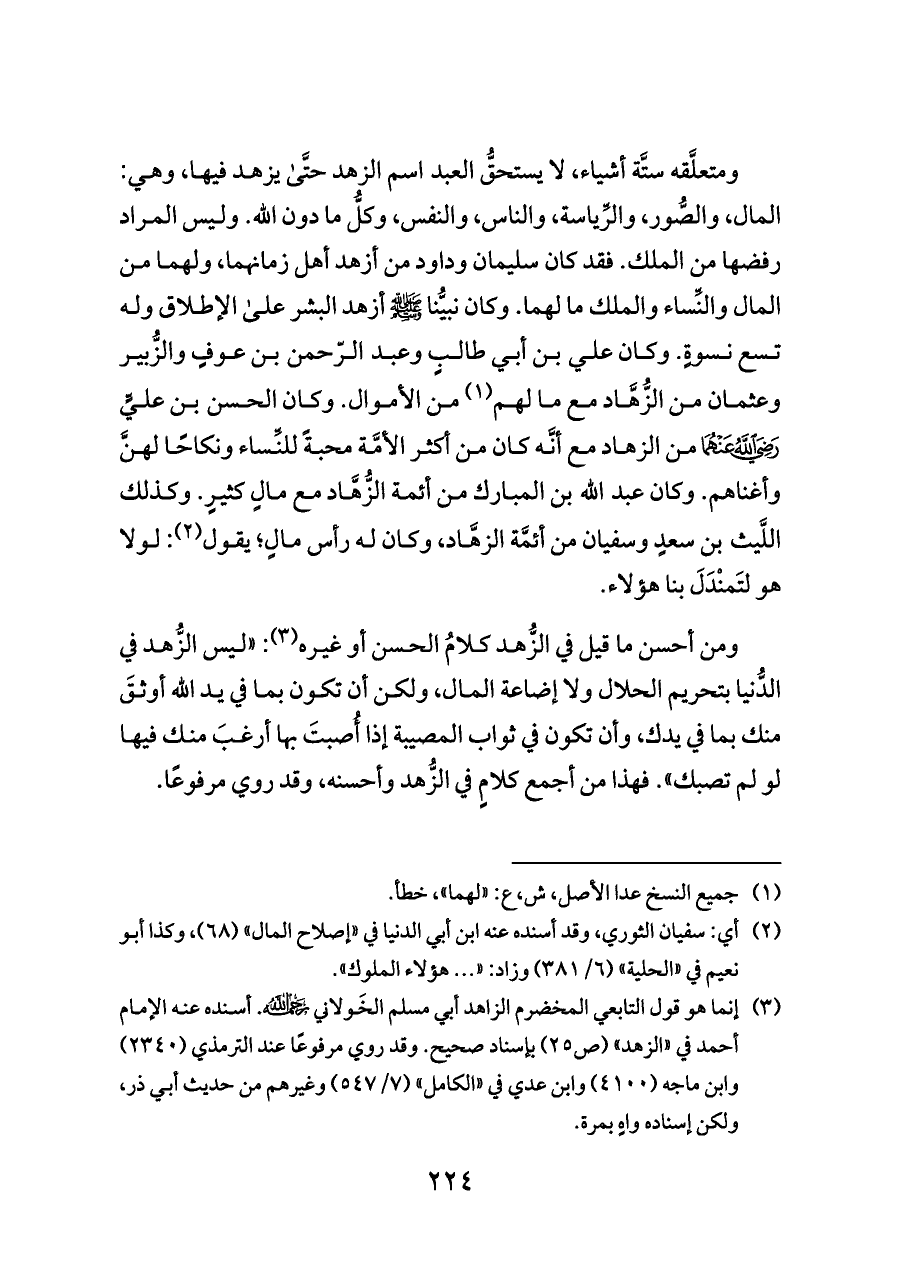 ومن أحسن ما قيل في الزُّهد كلامُ الحسن أو غيره (¬٣): «ليس الزُّهد في الدُّنيا بتحريم الحلال ولا إضاعة المال، ولكن أن تكون بما في يد الله أوثقَ منك بما في يدك، وأن تكون في ثواب المصيبة إذا أُصبتَ بها أرغبَ منك فيها لو لم تصبك». فهذا من أجمع كلامٍ في الزُّهد وأحسنه، وقد روي مرفوعًا.