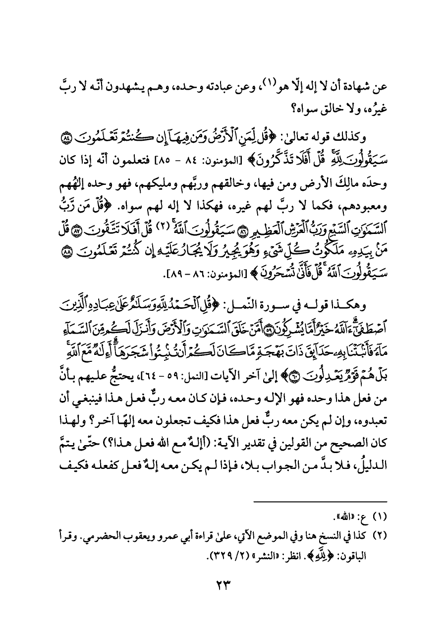 وكذلك قوله تعالى: {قُلْ لِمَنِ الْأَرْضُ وَمَنْ فِيهَا إِنْ كُنْتُمْ تَعْلَمُونَ (٨٤) سَيَقُولُونَ لِلَّهِ قُلْ أَفَلَا تَذَّكَّرُونَ} [المؤمنون: ٨٤ - ٨٥] فتعلمون أنّه إذا كان وحدَه مالِكَ الأرض ومن فيها، وخالقهم وربَّهم ومليكهم، فهو وحده إلهُهم ومعبودهم، فكما لا ربَّ لهم غيره، فهكذا لا إله لهم سواه. {قُلْ مَنْ رَبُّ السَّمَاوَاتِ السَّبْعِ وَرَبُّ الْعَرْشِ الْعَظِيمِ (٨٦) سَيَقُولُونَ اللَّهُ (¬٢) قُلْ أَفَلَا تَتَّقُونَ (٨٧) قُلْ مَنْ بِيَدِهِ مَلَكُوتُ كُلِّ شَيْءٍ وَهُوَ يُجِيرُ وَلَا يُجَارُ عَلَيْهِ إِنْ كُنْتُمْ تَعْلَمُونَ (٨٨) سَيَقُولُونَ اللَّهُ قُلْ فَأَنَّى تُسْحَرُونَ} [المؤمنون: ٨٦ - ٨٩].