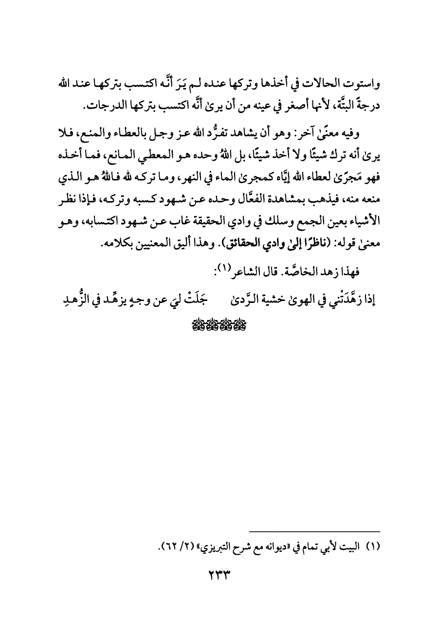 وفيه معنًى آخر: وهو أن يشاهد تفرُّد الله عز وجل بالعطاء والمنع، فلا يرى أنه ترك شيئًا ولا أخذ شيئًا، بل اللهُ وحده هو المعطي المانع، فما أخذه فهو مَجرًى لعطاء الله إيَّاه كمجرى الماء في النهر، وما تركه لله فاللهُ هو الذي منعه منه، فيذهب بمشاهدة الفعَّال وحده عن شهود كسبه وتركه، فإذا نظر الأشياء بعين الجمع وسلك في وادي الحقيقة غاب عن شهود اكتسابه، وهو معنى قوله: (ناظرًا إلى وادي الحقائق). وهذا أليق المعنيين بكلامه.