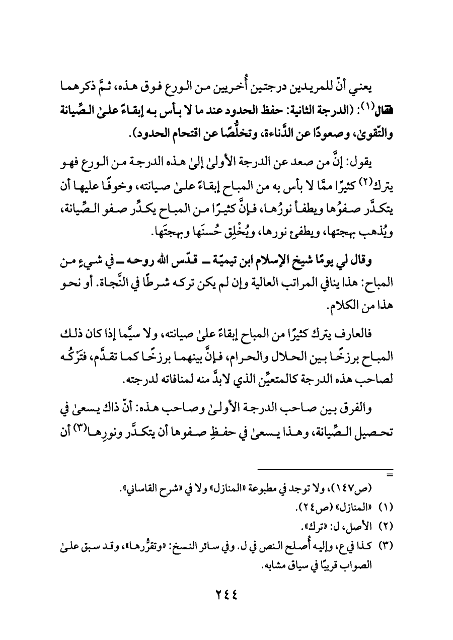 يقول: إنَّ من صعد عن الدرجة الأولى إلى هذه الدرجة من الورع فهو يترك (¬٢) كثيرًا ممَّا لا بأس به من المباح إبقاءً على صيانته، وخوفًا عليها أن يتكدَّر صفوُها ويطفأ نورُها، فإنَّ كثيرًا من المباح يكدِّر صفو الصِّيانة، ويُذهب بهجتها، ويطفئ نورها، ويُخْلِق حُسنَها وبهجتَها.