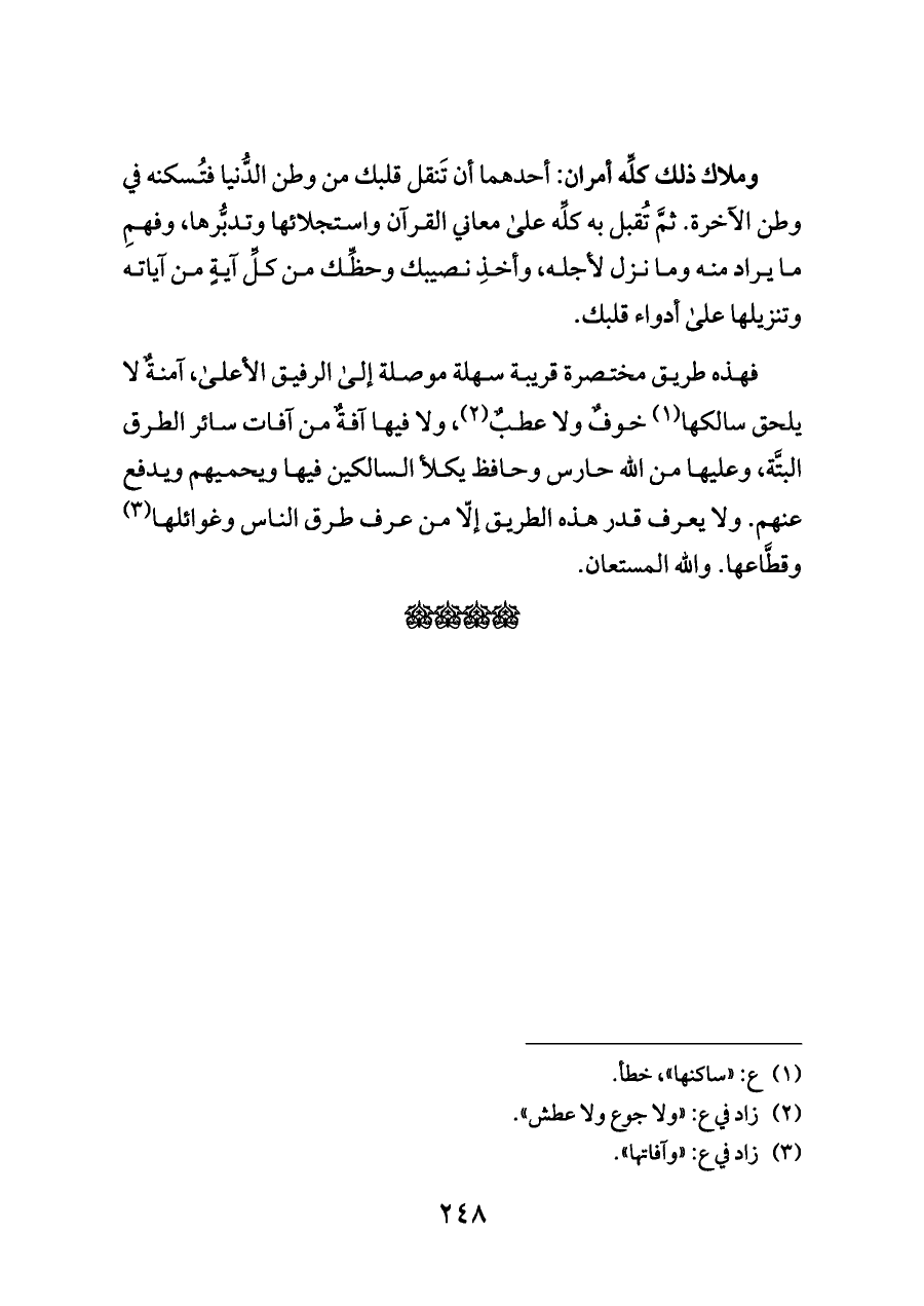 فهذه طريق مختصرة قريبة سهلة موصلة إلى الرفيق الأعلى، آمنةٌ لا يلحق سالكها (¬١) خوفٌ ولا عطبٌ (¬٢)، ولا فيها آفةٌ من آفات سائر الطرق البتَّة، وعليها من الله حارس وحافظ يكلأ السالكين فيها ويحميهم ويدفع عنهم. ولا يعرف قدر هذه الطريق إلّا من عرف طرق الناس وغوائلها (¬٣) وقطَّاعها. والله المستعان.