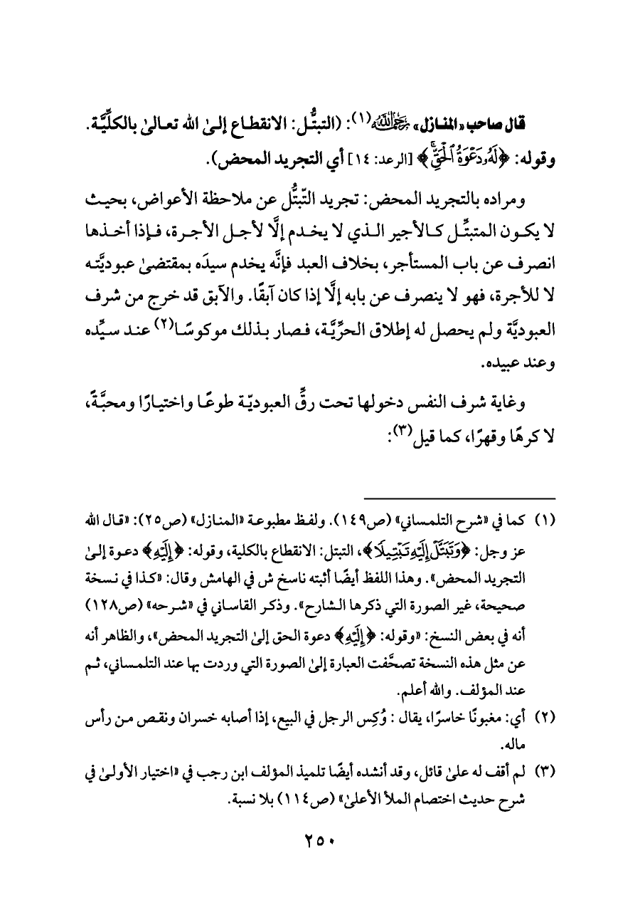 (¬١) كما في «شرح التلمساني» (ص ١٤٩). ولفظ مطبوعة «المنازل» (ص ٢٥): «قال الله عز وجل: {وَتَبَتَّلْ إِلَيْهِ تَبْتِيلًا}، التبتل: الانقطاع بالكلية، وقوله: {إِلَيْهِ} دعوة إلى التجريد المحض». وهذا اللفظ أيضًا أثبته ناسخ ش في الهامش وقال: «كذا في نسخة صحيحة، غير الصورة التي ذكرها الشارح». وذكر القاساني في «شرحه» (ص ١٢٨) أنه في بعض النسخ: «وقوله: {إِلَيْهِ} دعوة الحق إلى التجريد المحض»، والظاهر أنه عن مثل هذه النسخة تصحَّفت العبارة إلى الصورة التي وردت بها عند التلمساني، ثم عند المؤلف. والله أعلم.