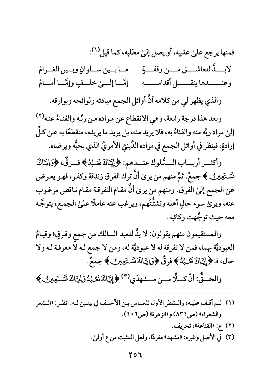 وأكثر أرباب السُّلوك عندهم: {إِيَّاكَ نَعْبُدُ} فرقٌ، {وَإِيَّاكَ نَسْتَعِينُ} جمعٌ. ثمَّ منهم من يرى أنَّ ترك الفرق زندقة وكفر، فهو يعرض عن الجمع إلى الفرق. ومنهم من يرى أنَّ مقام التفرقة مقام ناقص مرغوب عنه، ويرى سوء حالِ أهله وتشتُّتَهم، ويرغب عنه عاملًا على الجمع، يتوجَّه معه حيث توجَّهت ركائبه.