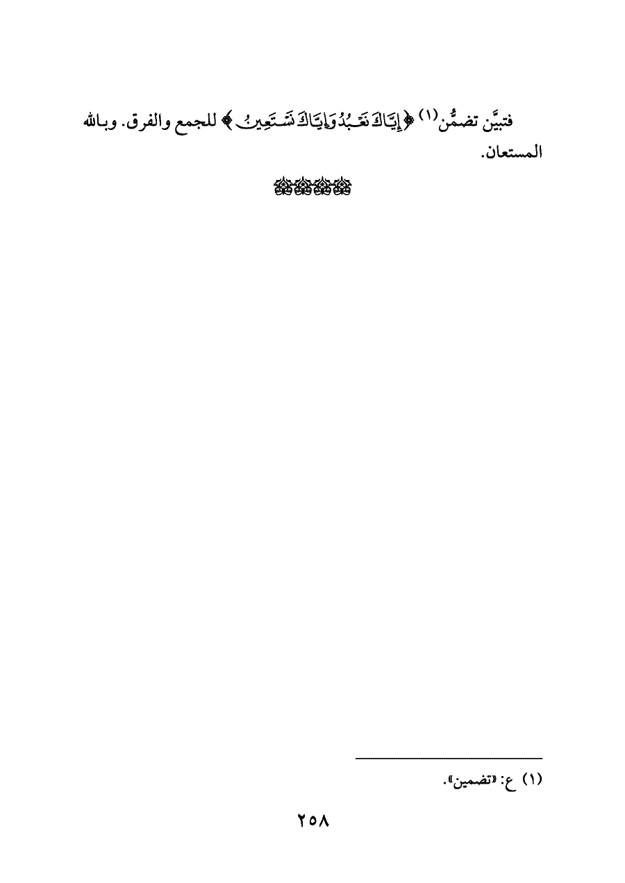 فتبيَّن تضمُّن (¬١) {إِيَّاكَ نَعْبُدُ وَإِيَّاكَ نَسْتَعِينُ} للجمع والفرق. وبالله المستعان.