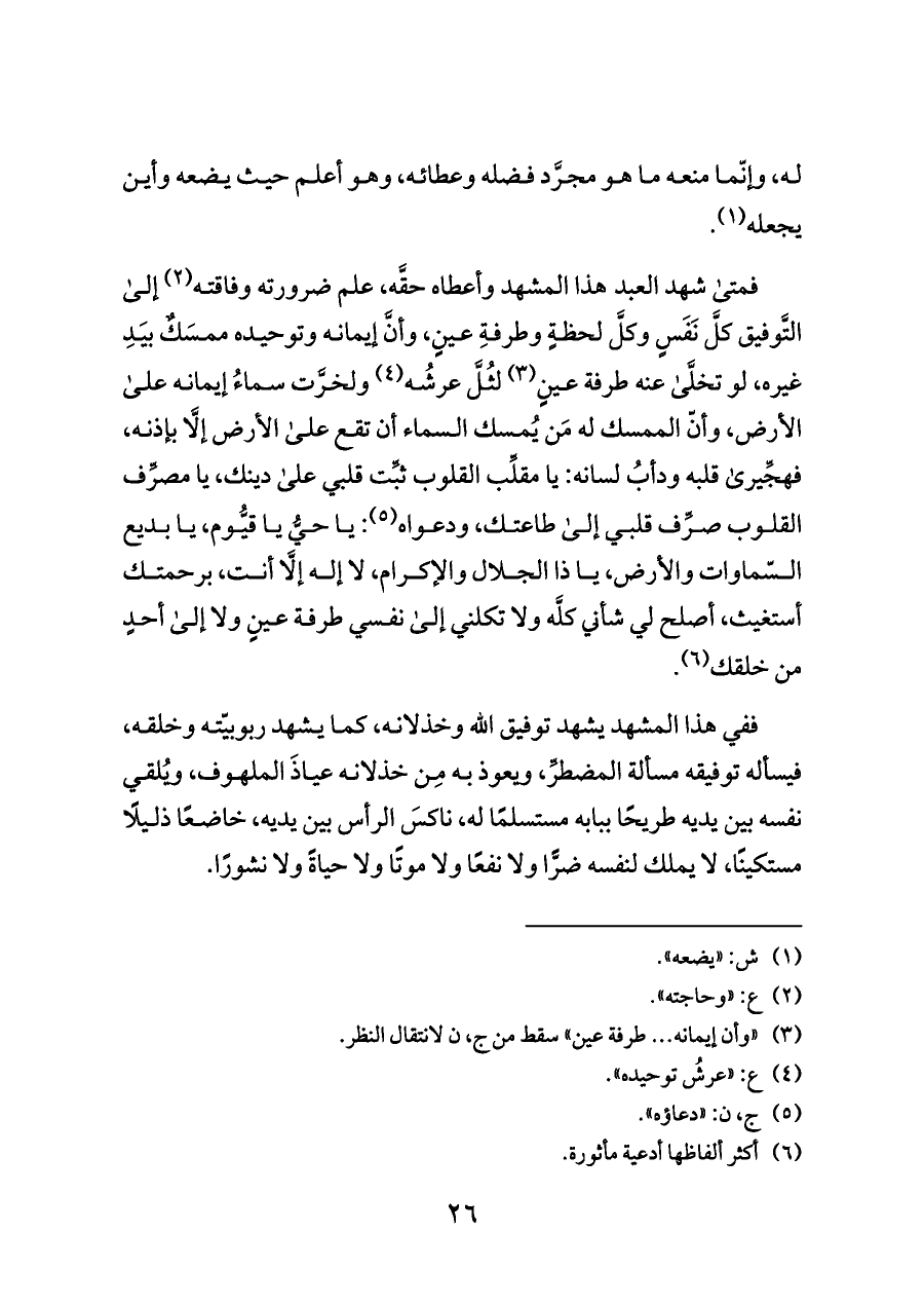 فمتى شهد العبد هذا المشهد وأعطاه حقَّه، علم ضرورته وفاقته (¬٢) إلى التَّوفيق كلَّ نَفَسٍ وكلَّ لحظةٍ وطرفةِ عينٍ، وأنَّ إيمانه وتوحيده ممسَكٌ بيَدِ غيره، لو تخلَّى عنه طرفة عينٍ (¬٣) لثُلَّ عرشُه (¬٤) ولخرَّت سماءُ إيمانه على الأرض، وأنّ الممسك له مَن يُمسك السماء أن تقع على الأرض إلَّا بإذنه، فهجِّيرى قلبه ودأبُ لسانه: يا مقلِّب القلوب ثبِّت قلبي على دينك، يا مصرِّف القلوب صرِّف قلبي إلى طاعتك، ودعواه (¬٥): يا حيُّ يا قيُّوم، يا بديع السّماوات والأرض، يا ذا الجلال والإكرام، لا إله إلَّا أنت، برحمتك أستغيث، أصلح لي شأني كلَّه ولا تكلني إلى نفسي طرفة عينٍ ولا إلى أحدٍ من خلقك (¬٦).