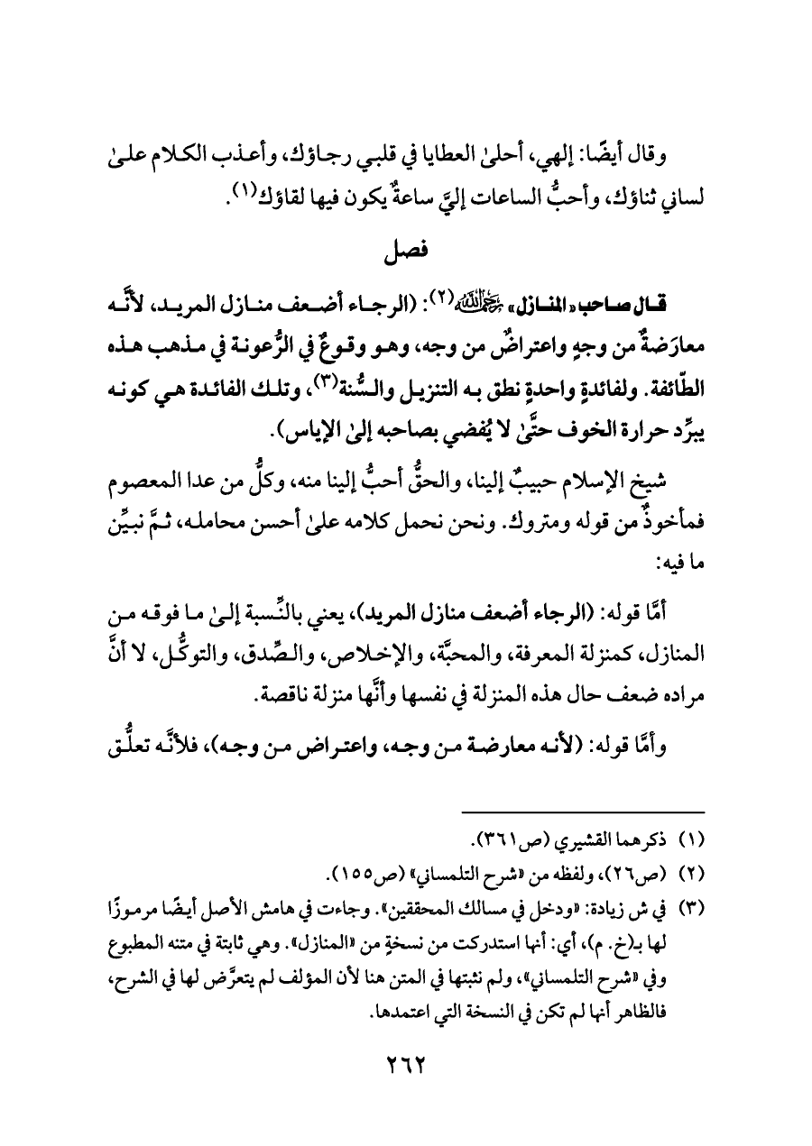 قال صاحب «المنازل» - رحمه الله - (¬٢): (الرجاء أضعف منازل المريد، لأنَّه معارَضةٌ من وجهٍ واعتراضٌ من وجه، وهو وقوعٌ في الرُّعونة في مذهب هذه الطّائفة. ولفائدةٍ واحدةٍ نطق به التنزيل والسُّنة (¬٣)، وتلك الفائدة هي كونه يبرِّد حرارة الخوف حتَّى لا يُفضي بصاحبه إلى الإياس).