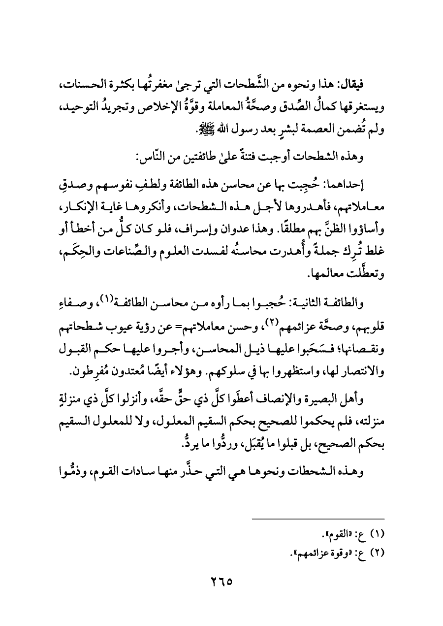 والطائفة الثانية: حُجبوا بما رأوه من محاسن الطائفة (¬١)، وصفاءِ قلوبهم، وصحَّة عزائمهم (¬٢)، وحسن معاملاتهم= عن رؤية عيوب شطحاتهم ونقصانها؛ فسَحَبوا عليها ذيل المحاسن، وأجروا عليها حكم القبول والانتصار لها، واستظهروا بها في سلوكهم. وهؤلاء أيضًا مُعتدون مُفرِطون.