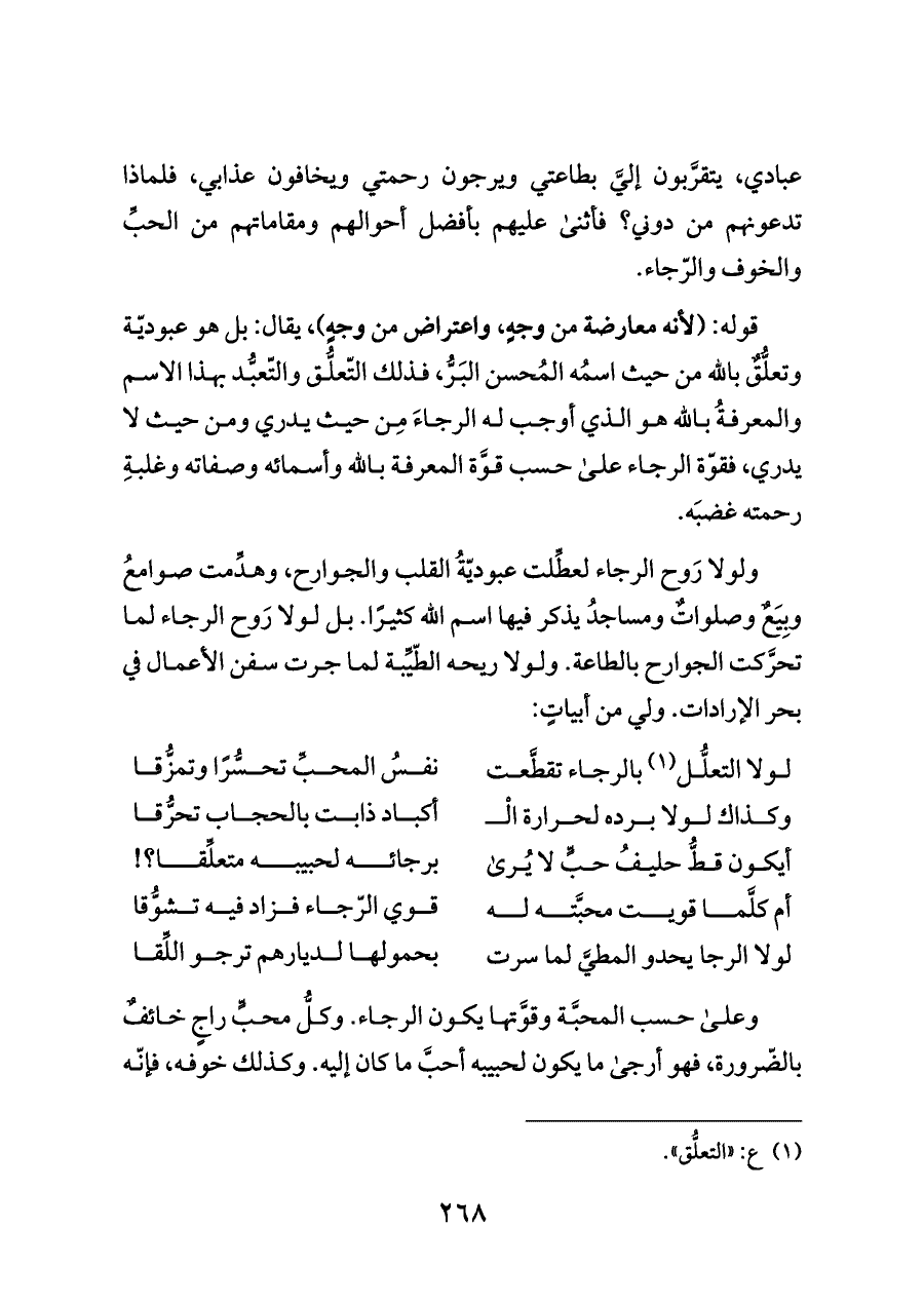 ولولا رَوح الرجاء لعطِّلت عبوديّةُ القلب والجوارح، وهدِّمت صوامعُ وبِيَعٌ وصلواتٌ ومساجدُ يذكر فيها اسم الله كثيرًا. بل لولا رَوح الرجاء لما تحرَّكت الجوارح بالطاعة. ولولا ريحه الطّيِّبة لما جرت سفن الأعمال في بحر الإرادات. ولي من أبياتٍ: