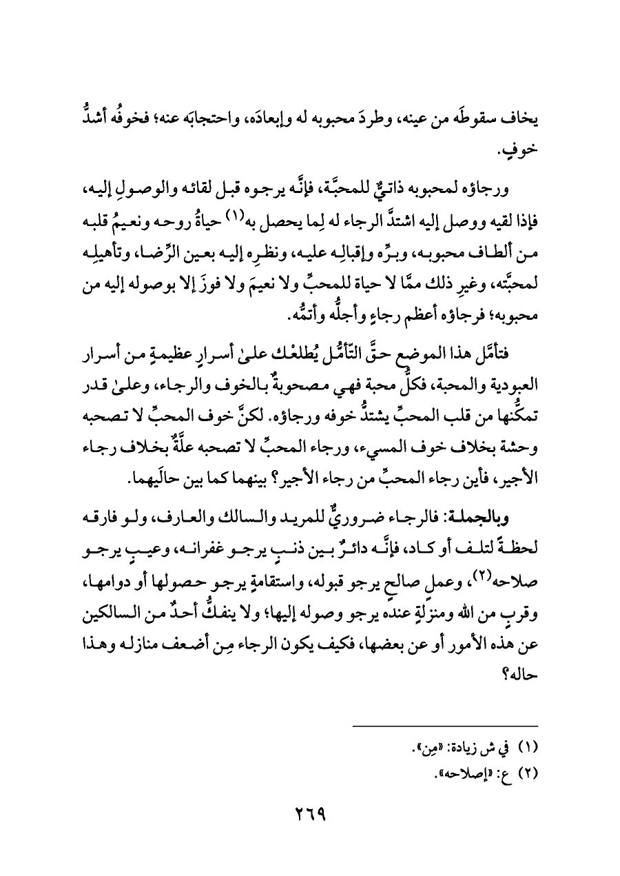 فتأمَّل هذا الموضع حقَّ التّأمُّل يُطلعْك على أسرارٍ عظيمةٍ من أسرار العبودية والمحبة، فكلُّ محبة فهي مصحوبةٌ بالخوف والرجاء، وعلى قدر تمكُّنها من قلب المحبِّ يشتدُّ خوفه ورجاؤه. لكنَّ خوف المحبِّ لا تصحبه وحشة بخلاف خوف المسيء، ورجاء المحبِّ لا تصحبه علَّةٌ بخلاف رجاء الأجير، فأين رجاء المحبِّ من رجاء الأجير؟ بينهما كما بين حالَيهما.