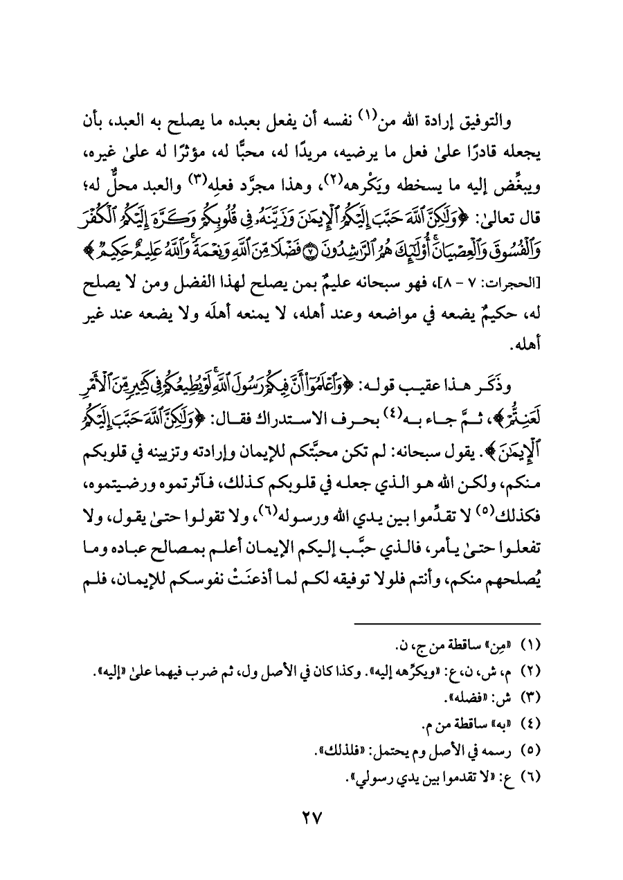 وذَكَر هذا عقيب قوله: {وَاعْلَمُوا أَنَّ فِيكُمْ رَسُولَ اللَّهِ لَوْ يُطِيعُكُمْ فِي كَثِيرٍ مِنَ الْأَمْرِ لَعَنِتُّمْ}، ثمَّ جاء به (¬٤) بحرف الاستدراك فقال: {وَلَكِنَّ اللَّهَ حَبَّبَ إِلَيْكُمُ الْإِيمَانَ}. يقول سبحانه: لم تكن محبَّتكم للإيمان وإرادته وتزيينه في قلوبكم منكم، ولكن الله هو الذي جعله في قلوبكم كذلك، فآثرتموه ورضيتموه، فكذلك (¬٥) لا تقدِّموا بين يدي الله ورسوله (¬٦)، ولا تقولوا حتى يقول، ولا تفعلوا حتى يأمر، فالذي حبَّب إليكم الإيمان أعلم بمصالح عباده وما يُصلحهم منكم، وأنتم فلولا توفيقه لكم لما أذعنَتْ نفوسكم للإيمان، فلم