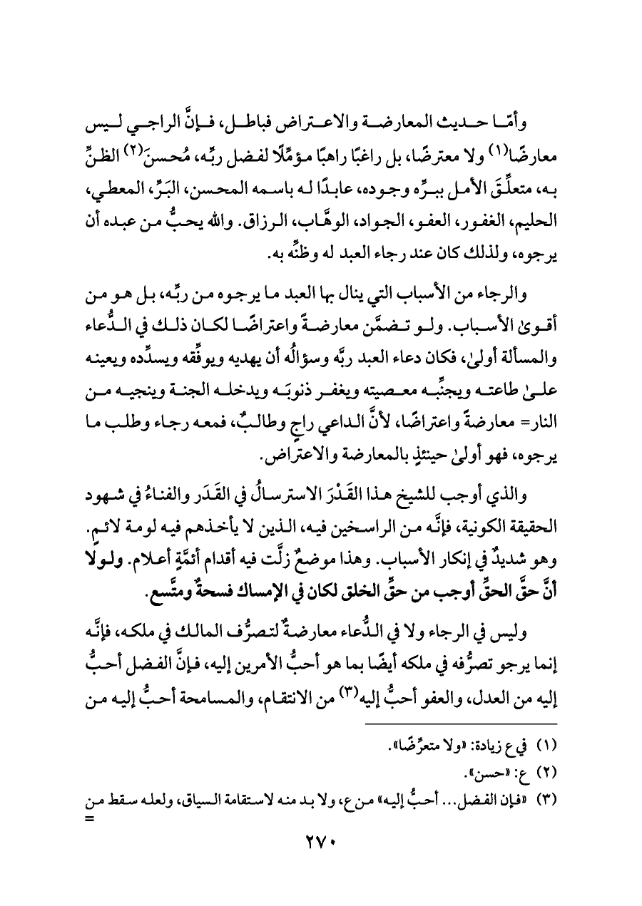 وأمّا حديث المعارضة والاعتراض فباطل، فإنَّ الراجي ليس معارضًا (¬١) ولا معترضًا، بل راغبًا راهبًا مؤمِّلًا لفضل ربِّه، مُحسنَ (¬٢) الظنِّ به، متعلِّقَ الأمل ببرِّه وجوده، عابدًا له باسمه المحسن، البَرِّ، المعطي، الحليم، الغفور، العفو، الجواد، الوهَّاب، الرزاق. والله يحبُّ من عبده أن يرجوه، ولذلك كان عند رجاء العبد له وظنِّه به.