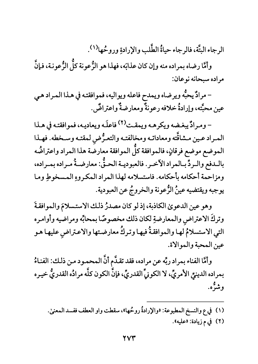 - مرادٌ يحبُّه ويرضاه ويمدح فاعله ويواليه، فموافقته في هذا المراد هي عين محبَّته، وإرادةُ خلافه رعونةٌ ومعارضةٌ واعتراضٌ.