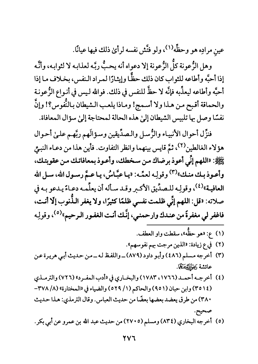 فنزِّل أحوال الأنبياء والرُّسل والصدِّيقين وسؤالَهم ربَّهم على أحوال هؤلاء الغالطين (¬٢)، ثمَّ قايس بينهما وانظر التفاوت. فأين هذا من دعاء النبيِّ - صلى الله عليه وسلم -: «اللهم إنِّي أعوذ برضاك من سخطك، وأعوذ بمعافاتك من عقوبتك، وأعوذ بك منك» (¬٣) وقولِه لعمِّه: «يا عبَّاسُ، يا عمَّ رسول الله، سل الله العافية» (¬٤)، وقولِه للصدِّيق الأكبر وقد سأله أن يعلِّمه دعاءً يدعو به في صلاته: «قل: اللهم إنِّي ظلمت نفسي ظلمًا كثيرًا، ولا يغفر الذُّنوب إلّا أنت، فاغفر لي مغفرةً من عندك وارحمني، إنَّك أنت الغفور الرحيم» (¬٥)، وقولِه