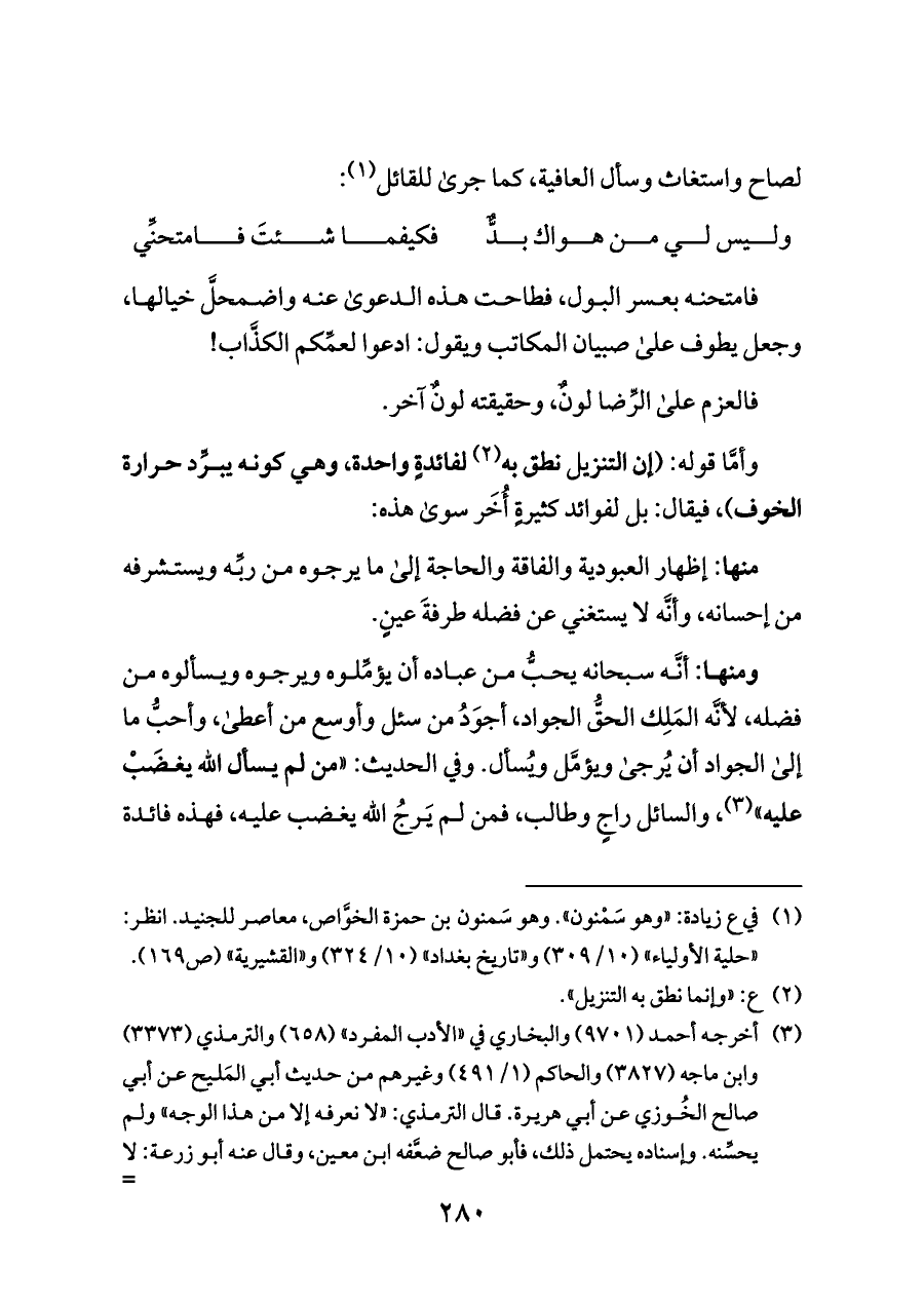 (¬١) في ع زيادة: «وهو سَمْنون». وهو سَمنون بن حمزة الخوَّاص، معاصر للجنيد. انظر: «حلية الأولياء» (١٠/ ٣٠٩) و «تاريخ بغداد» (١٠/ ٣٢٤) و «القشيرية» (ص ١٦٩).