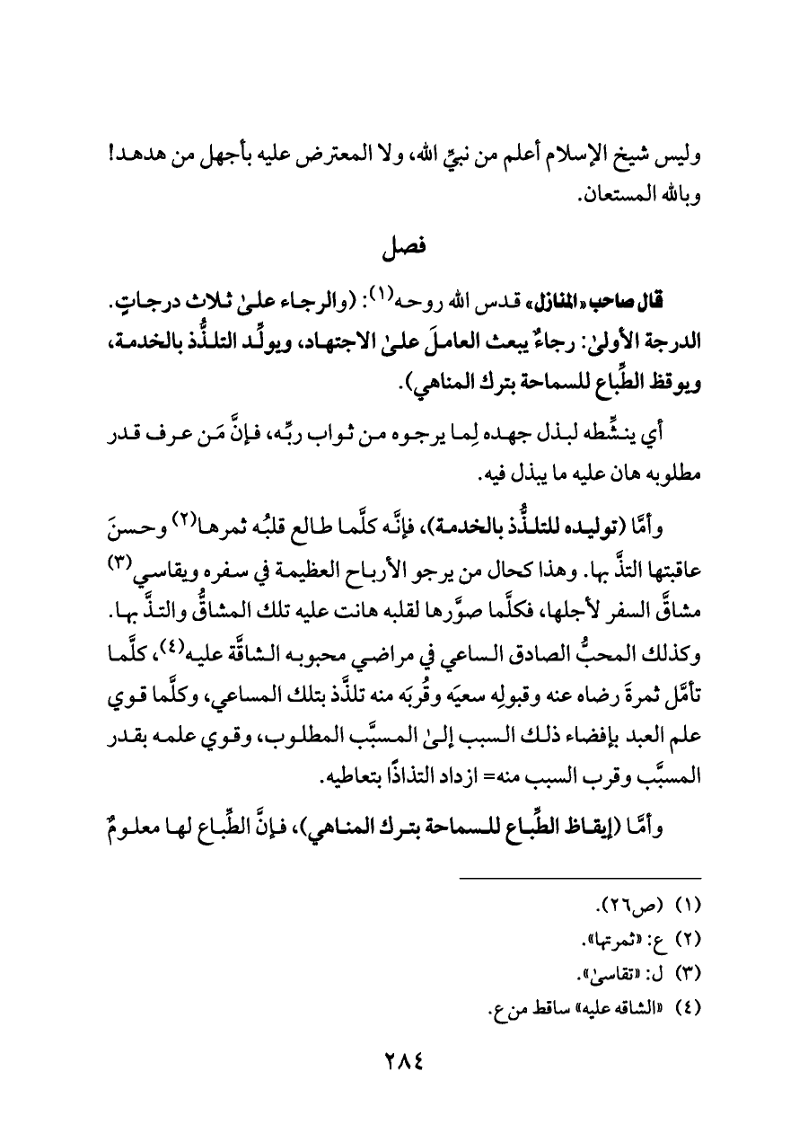 قال صاحب «المنازل» قدس الله روحه (¬١): (والرجاء على ثلاث درجاتٍ. الدرجة الأولى: رجاءٌ يبعث العاملَ على الاجتهاد، ويولِّد التلذُّذ بالخدمة، ويوقظ الطِّباع للسماحة بترك المناهي).