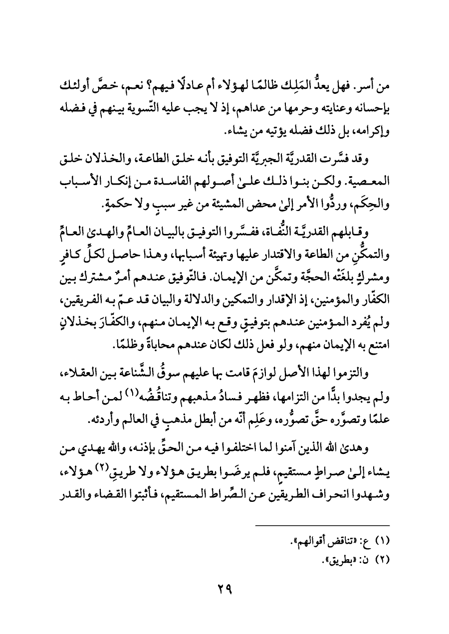 وقابلهم القدريَّة النُّفاة، ففسَّروا التوفيق بالبيان العامِّ والهدى العامِّ والتمكُّنِ من الطاعة والاقتدار عليها وتهيئة أسبابها، وهذا حاصل لكلِّ كافرٍ ومشركٍ بلغَتْه الحجَّة وتمكَّن من الإيمان. فالتّوفيق عندهم أمرٌ مشترك بين الكفّار والمؤمنين، إذ الإقدار والتمكين والدلالة والبيان قد عمّ به الفريقين، ولم يُفرد المؤمنين عندهم بتوفيقٍ وقع به الإيمان منهم، والكفّارَ بخذلانٍ امتنع به الإيمان منهم، ولو فعل ذلك لكان عندهم محاباةً وظلمًا.