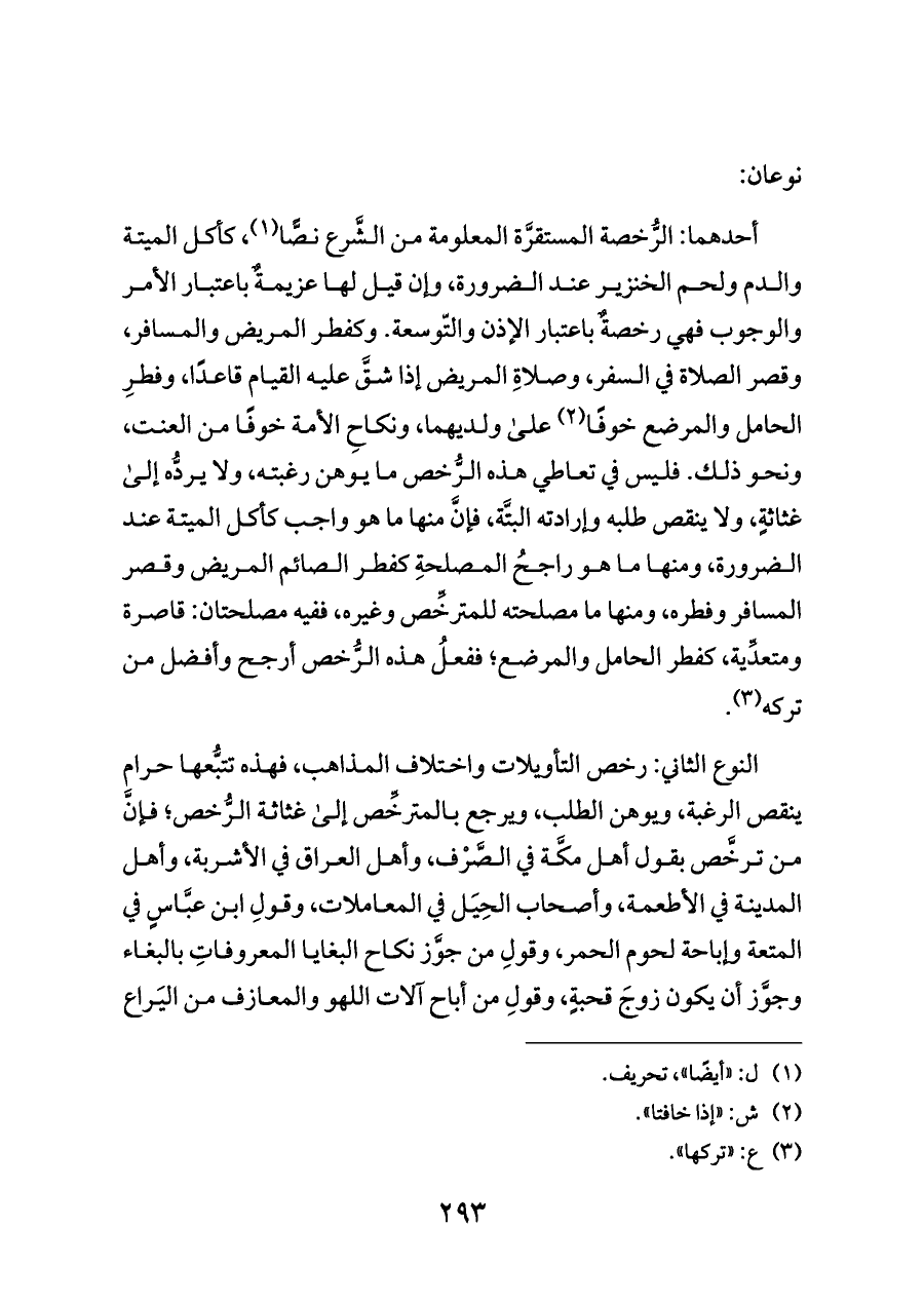 النوع الثاني: رخص التأويلات واختلاف المذاهب، فهذه تتبُّعها حرام ينقص الرغبة، ويوهن الطلب، ويرجع بالمترخِّص إلى غثاثة الرُّخص؛ فإنَّ من ترخَّص بقول أهل مكَّة في الصَّرْف، وأهل العراق في الأشربة، وأهل المدينة في الأطعمة، وأصحاب الحِيَل في المعاملات، وقولِ ابن عبَّاسٍ في المتعة وإباحة لحوم الحمر، وقولِ من جوَّز نكاح البغايا المعروفاتِ بالبغاء وجوَّز أن يكون زوجَ قحبةٍ، وقولِ من أباح آلات اللهو والمعازف من اليَراع