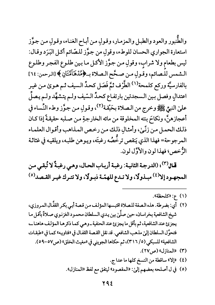 والطُّنبور والعود والطبل والمزمار، وقولِ من أباح الغناء، وقولِ من جوَّز استعارة الجواري الحسان للوطء، وقولِ من جوَّز للصّائم أكل البَرَد وقال: ليس بطعامٍ ولا شرابٍ، وقولِ من جوَّز الأكل ما بين طلوع الفجر وطلوع الشمس للصائم، وقولِ من صحَّح الصلاة بـ {(٦٣)} [الرحمن: ٦٤] بالفارسيَّة وركع كلمحة (¬١) الطَّرْف ثمَّ فَصَل كحدِّ السيف ثم هوى من غير اعتدالٍ وفصل بين السجدتين بارتفاع كحدِّ السّيف ولم يتشهَّد ولم يصلِّ على النبيِّ - صلى الله عليه وسلم - وخرج من الصلاة بحَبْقة (¬٢)، وقولِ من جوَّز وطء النِّساء في أعجازهنَّ، ونكاحَ بنته المخلوقة من مائه الخارجةِ من صلبه حقيقةً إذا كان ذلك الحمل من زنًى، وأمثالِ ذلك من رخص المذاهب وأقوال العلماء المرجوحة= فهذا الذي يَنقص ترخُّصُه رغبتَه، ويوهن طلبه، ويلقيه في غثاثة الرُّخص؛ فهذا لون والأوَّل لون.