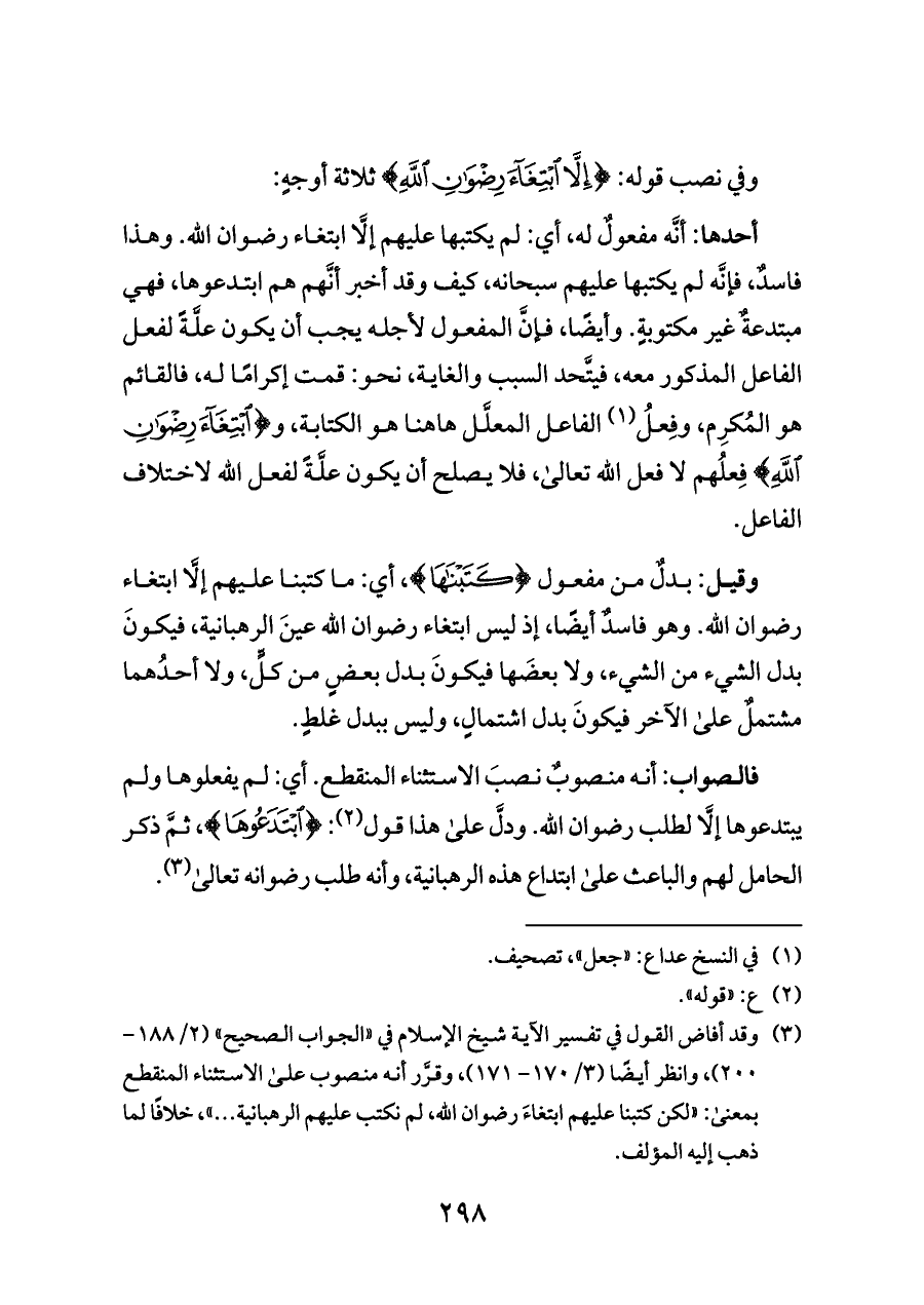 فالصواب: أنه منصوبٌ نصبَ الاستثناء المنقطع. أي: لم يفعلوها ولم يبتدعوها إلَّا لطلب رضوان الله. ودلَّ على هذا قول (¬٢): {كَتَبْنَاهَا}، ثمَّ ذكر الحامل لهم والباعث على ابتداع هذه الرهبانية، وأنه طلب رضوانه تعالى (¬٣).