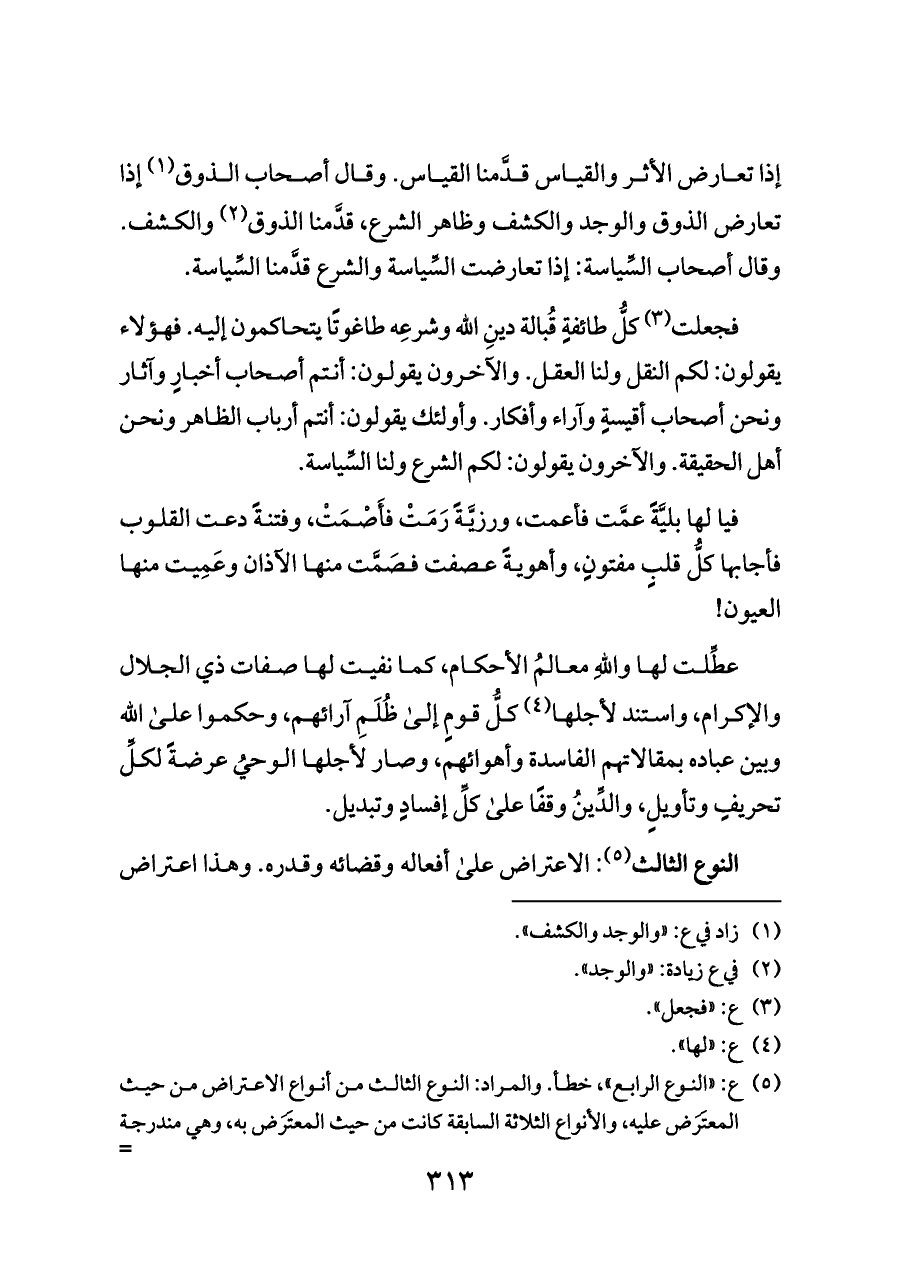 (¬٥) ع: «النوع الرابع»، خطأ. والمراد: النوع الثالث من أنواع الاعتراض من حيث المعتَرَض عليه، والأنواع الثلاثة السابقة كانت من حيث المعتَرَض به، وهي مندرجة تحت الثاني: الاعتراض على شرعه.