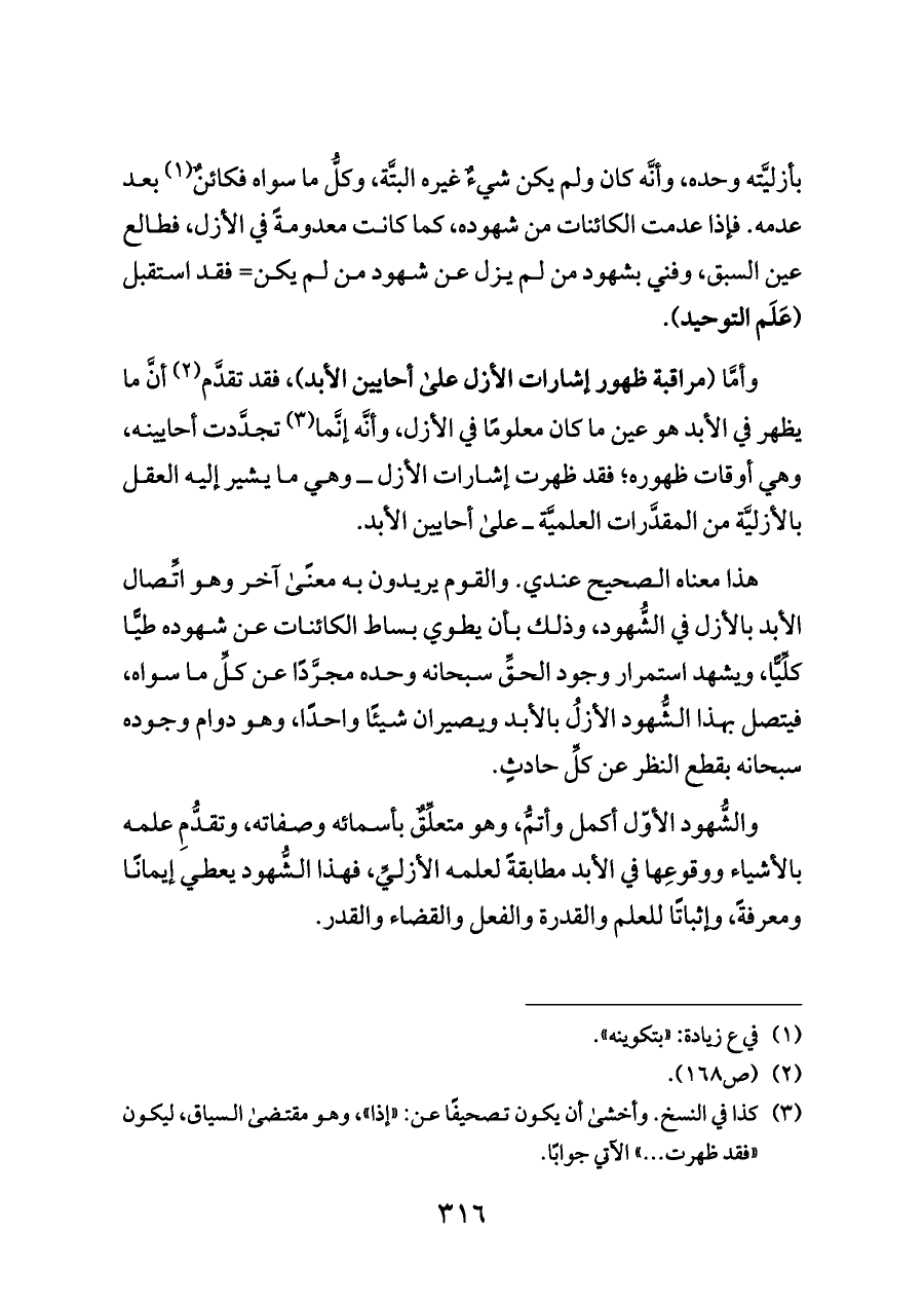 وأمَّا (مراقبة ظهور إشارات الأزل على أحايين الأبد)، فقد تقدَّم (¬٢) أنَّ ما يظهر في الأبد هو عين ما كان معلومًا في الأزل، وأنَّه إنَّما (¬٣) تجدَّدت أحايينه، وهي أوقات ظهوره؛ فقد ظهرت إشارات الأزل ــ وهي ما يشير إليه العقل بالأزليَّة من المقدَّرات العلميَّة ــ على أحايين الأبد.