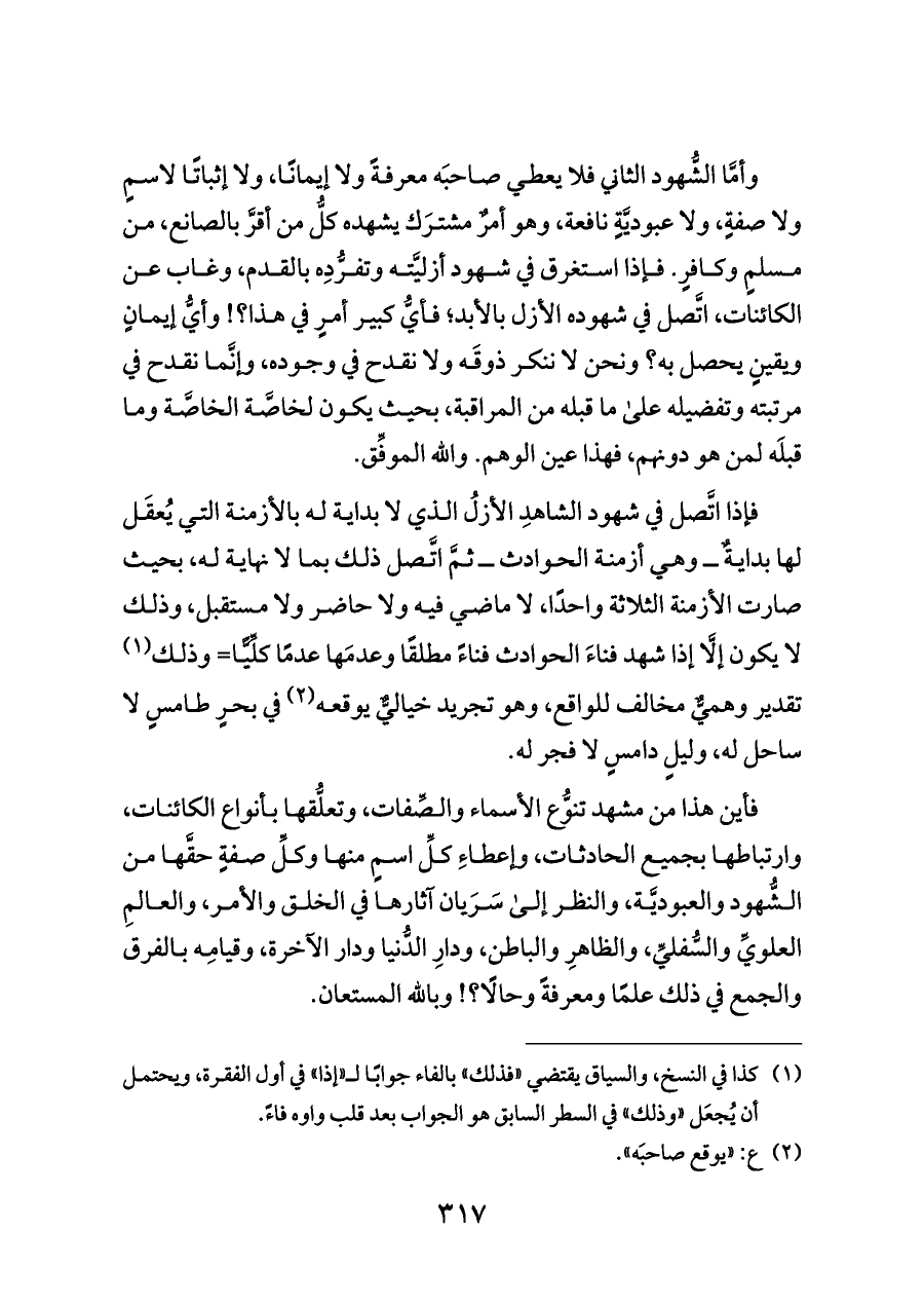 فإذا اتَّصل في شهود الشاهدِ الأزلُ الذي لا بداية له بالأزمنة التي يُعقَل لها بدايةٌ ــ وهي أزمنة الحوادث ــ ثمَّ اتَّصل ذلك بما لا نهاية له، بحيث صارت الأزمنة الثلاثة واحدًا، لا ماضي فيه ولا حاضر ولا مستقبل، وذلك لا يكون إلَّا إذا شهد فناءَ الحوادث فناءً مطلقًا وعدمَها عدمًا كلِّيًّا= وذلك (¬١) تقدير وهميٌّ مخالف للواقع، وهو تجريد خياليٌّ يوقعه (¬٢) في بحرٍ طامسٍ لا ساحل له، وليلٍ دامسٍ لا فجر له.