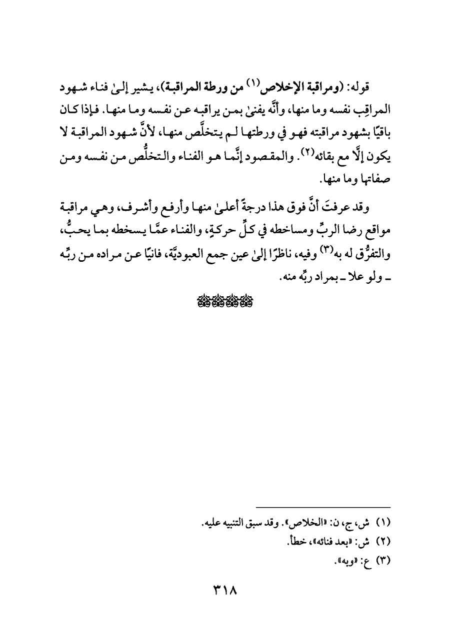 قوله: (ومراقبة الإخلاص (¬١) من ورطة المراقبة)، يشير إلى فناء شهود المراقِب نفسه وما منها، وأنَّه يفنى بمن يراقبه عن نفسه وما منها. فإذا كان باقيًا بشهود مراقبته فهو في ورطتها لم يتخلَّص منها، لأنَّ شهود المراقبة لا يكون إلَّا مع بقائه (¬٢). والمقصود إنَّما هو الفناء والتخلُّص من نفسه ومن صفاتها وما منها.